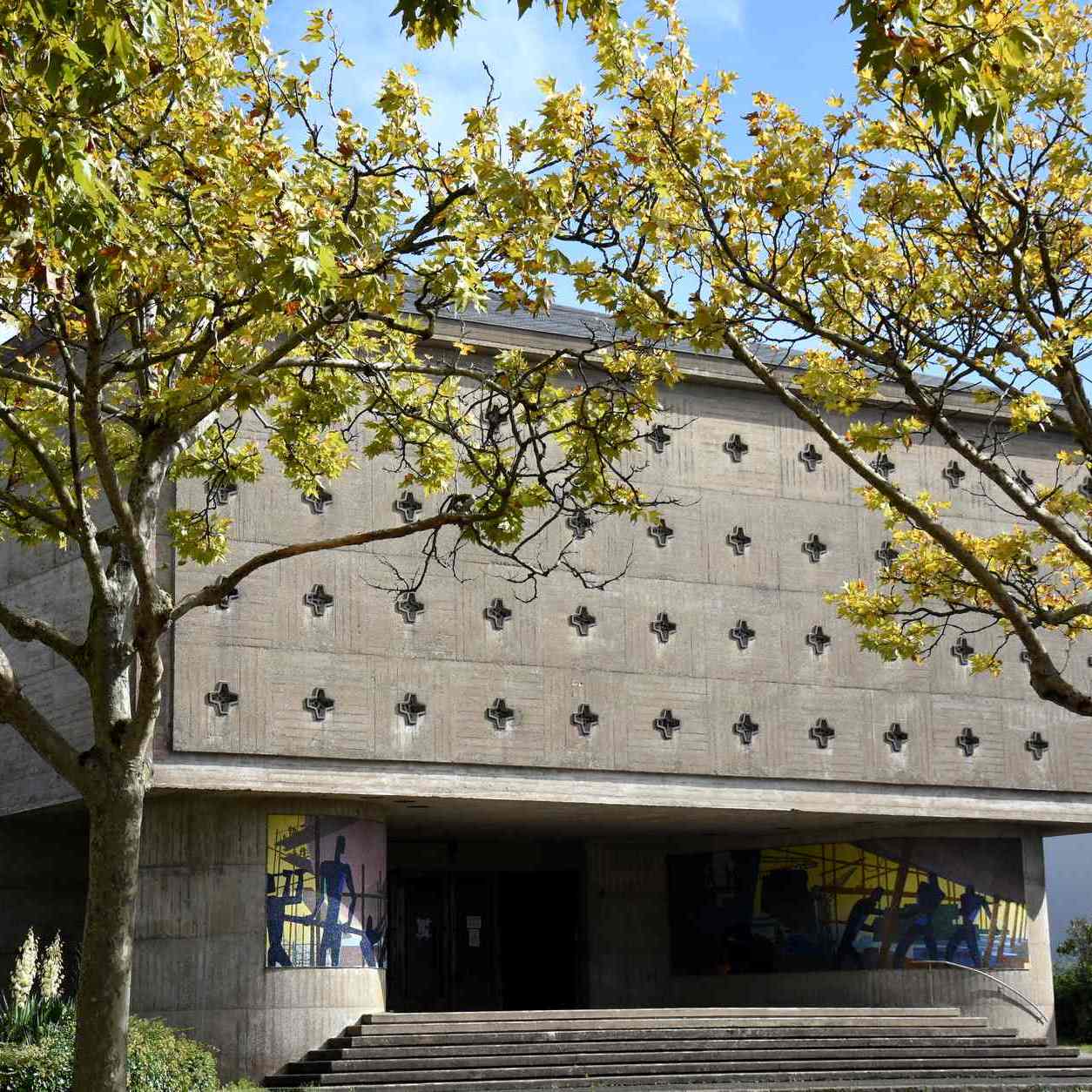 J’imagine que certains paroissiens ont dû être surpris en découvrant leur nouvelle église ! Un énorme cube en béton, dont la façade a comme seul ornement un ensemble de 48 petites ouvertures vitrées en forme de croix.