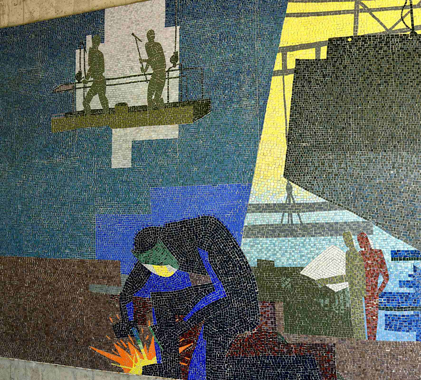 Très visibles en revanche, ces deux grandes mosaïques qui ornent les piliers de l’église Sainte-Anne. Elles représentent des scènes de la construction navale, avec échafaudages, soudeur, plaques de tôle et flèches de grues… La mosaïque a été réalisée en 1957 par l’atelier Barillet selon le dessin de l’affichiste Paul Colin.