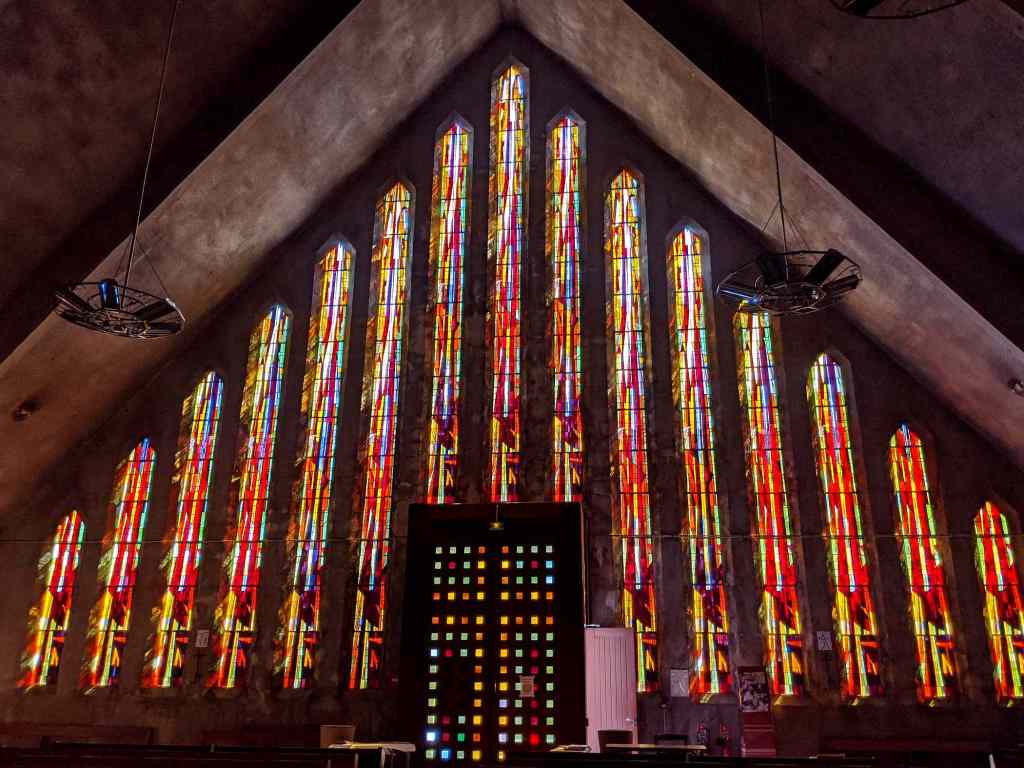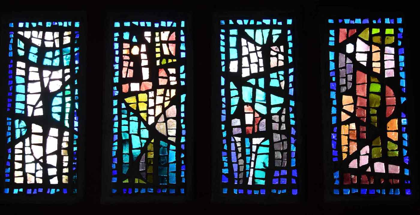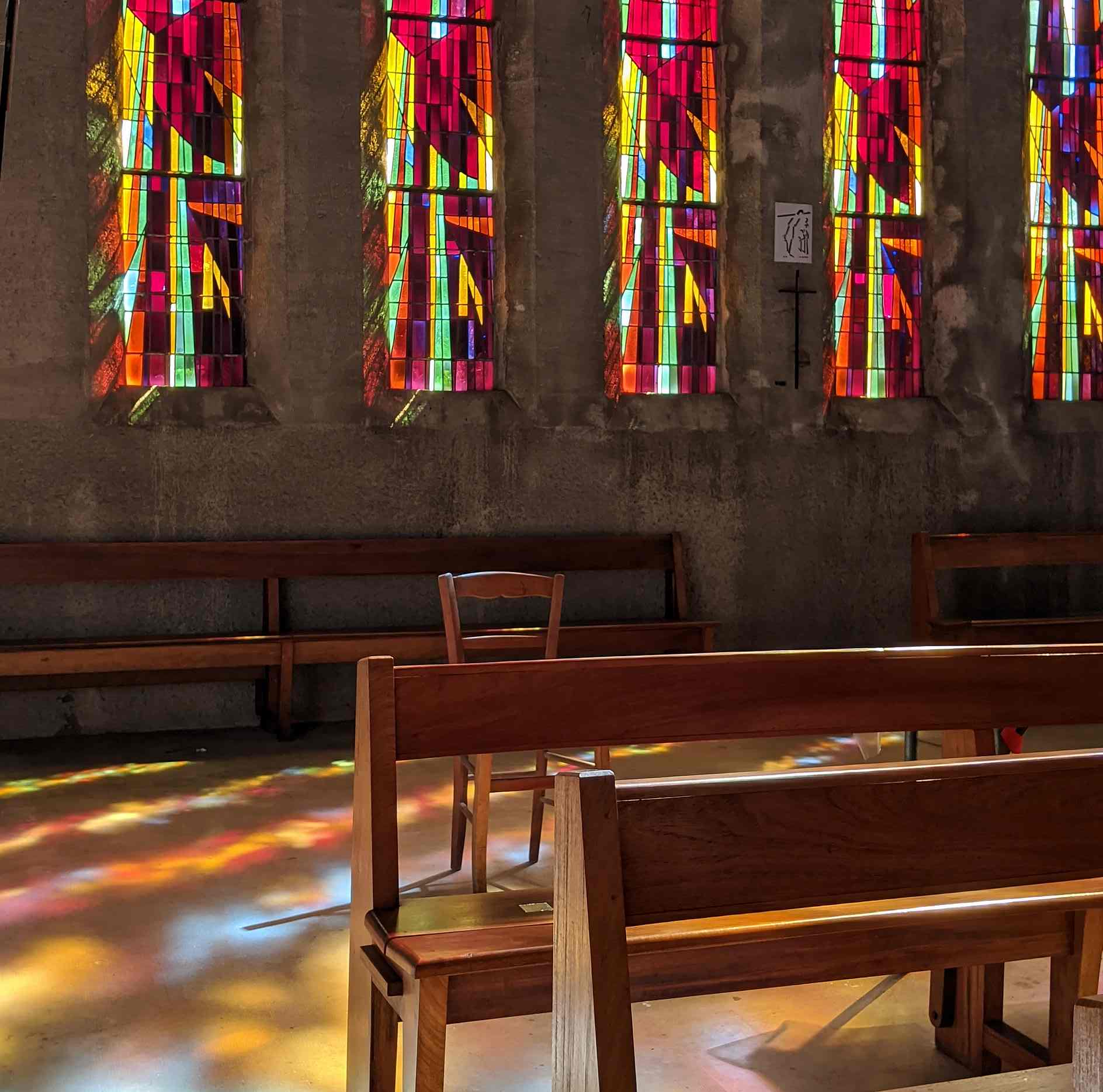 Ici c’est la technique de la dalle de verre qui a été utilisée pour les vitraux : d’épaisses dalles de verre coloré sont prises dans du ciment, formant des mosaïques abstraites dans de très beaux jeux de couleurs.