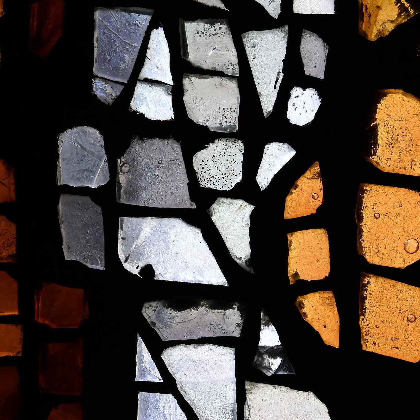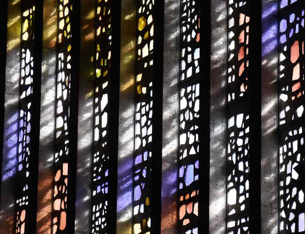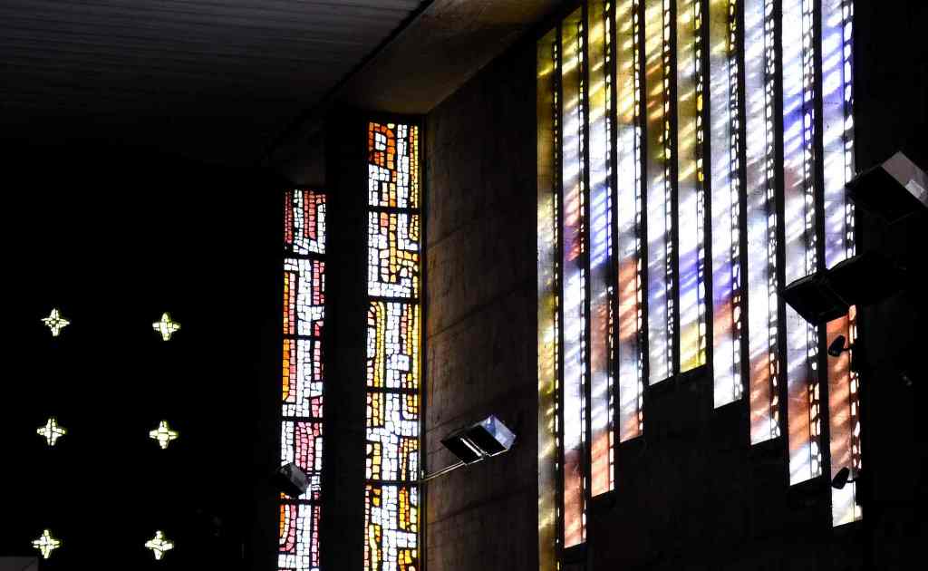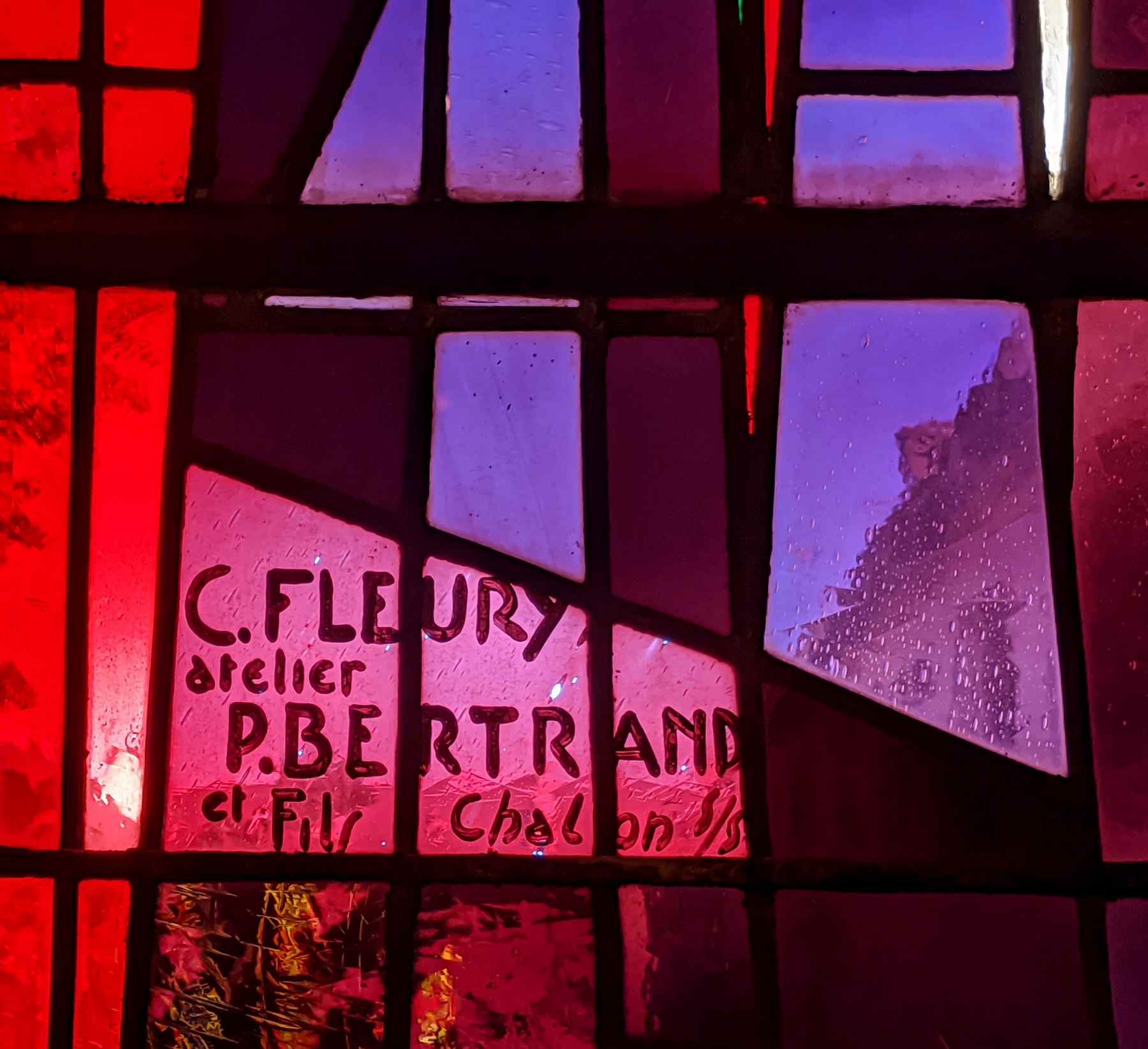Ici c’est la technique de la dalle de verre qui a été utilisée pour les vitraux : d’épaisses dalles de verre coloré sont prises dans du ciment, formant des mosaïques abstraites dans de très beaux jeux de couleurs.