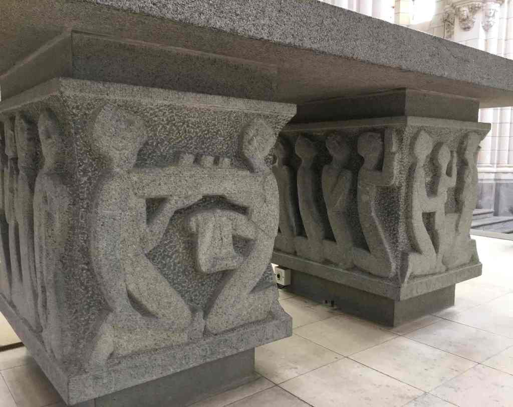 Ce vitrail me donne aussi une excellente transition : il montre bien à quel point la construction navale et les paquebots (en l’occurrence les anciens transatlantiques) sont présents à Saint-Nazaire, physiquement, dans les têtes et jusque dans les églises. Voici deux autres exemples, l’un très visible, l’autre plus discret. Ce dernier, il faut le chercher dans l’église Saint-Nazaire. Regardez bien le maître-autel : sur une des faces on voit l’offrande du paquebot Normandie par deux ouvriers de la navale. L’autel, en granit de Ploumanac’h, a été sculpté en 1956 par Jean Mazuet.