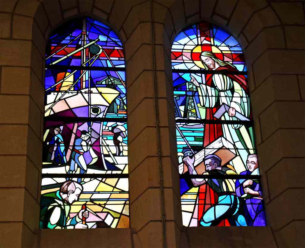Mais je voudrais surtout vous présenter deux vitraux tout à fait uniques, sur le mur ouest de l’église. Ils ne représentent pas une scène biblique, même si le personnage de Jésus est présent, mais montrent la construction navale de leur époque (1952) : paquebot sur cale de construction, ouvriers, charpentiers de marine, outillage, tout y est ! Et on est bien à Saint-Nazaire puisqu’on aperçoit la grue Gusto, la célèbre « Grand-Mère » du chantier nazairien, qui allait être démolie une quarantaine d’années plus tard…