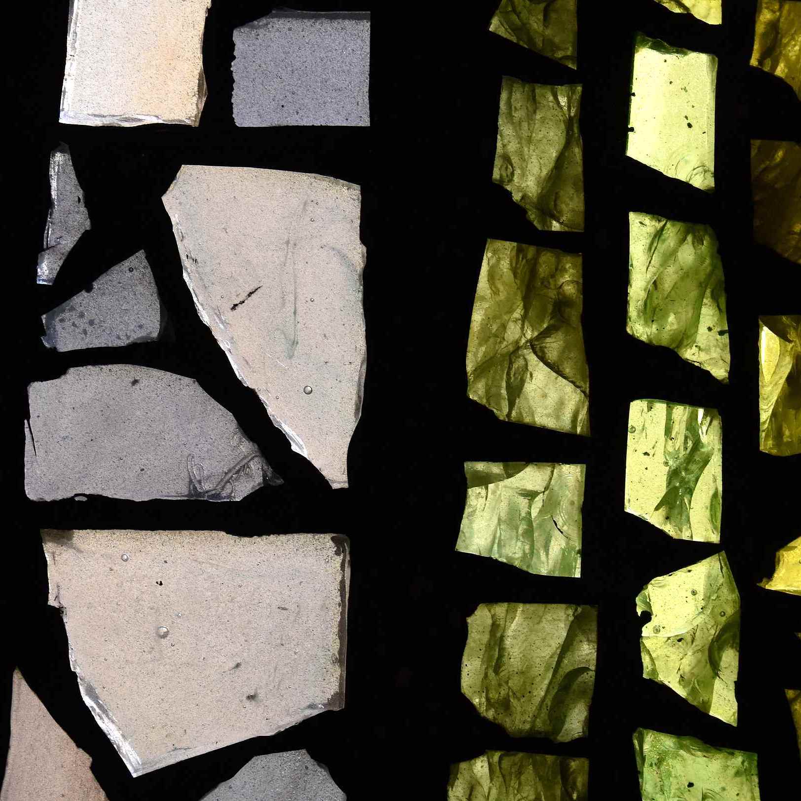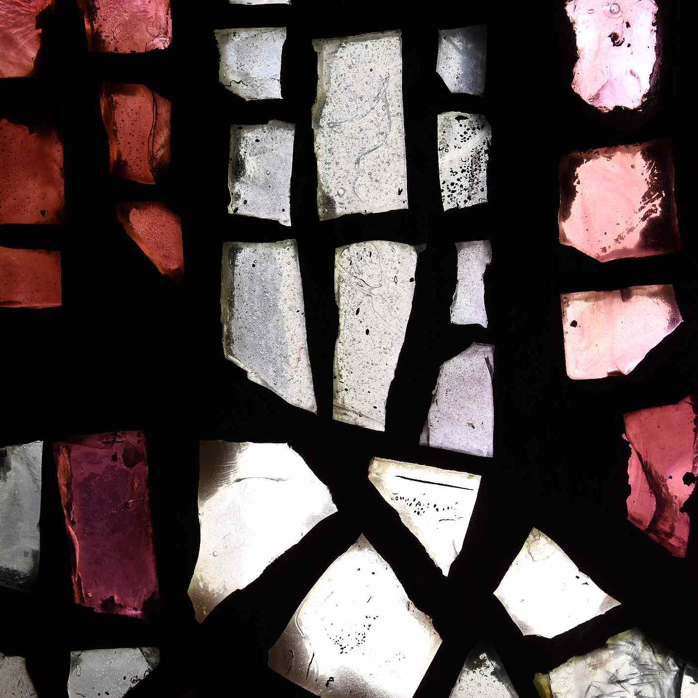 Et comme dans une cathédrale gothique – même si ici les motifs sont abstraits -, les murs semblent disparaître, remplacés par des vitraux, des panneaux de verre hauts et étroits. Les tons vifs et chauds de ces compositions très dynamiques baignent l’espace dans une belle ambiance lumineuse ; le soleil en rajoute en dessinant des reflets à travers les panneaux de verre.