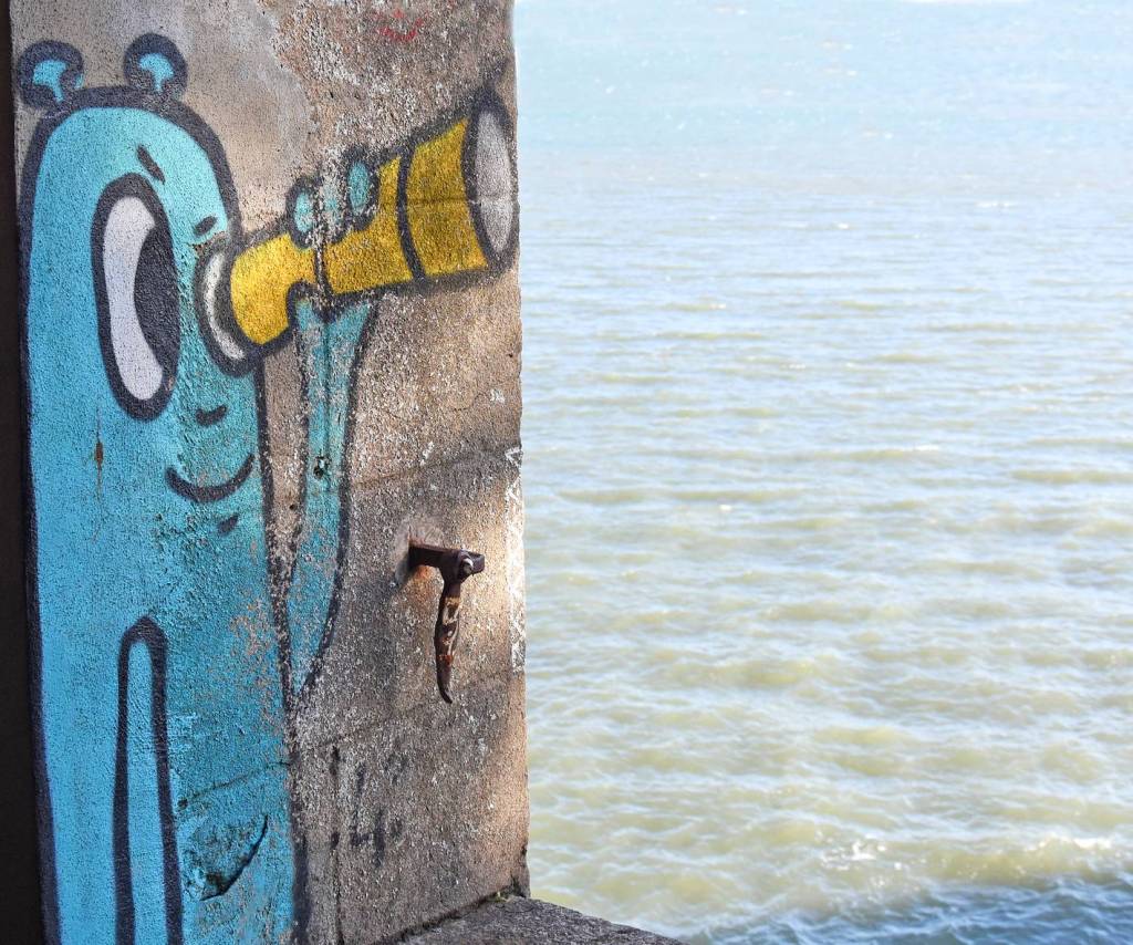 Mais il y a aussi des initiatives privées. Dans le quartier de Kerlédé, près du chemin côtier, arrêtez-vous devant « Oceanic Dreams », une fresque du graffeur nantais Sébastien Bouchard sur la façade d’une maison particulière.