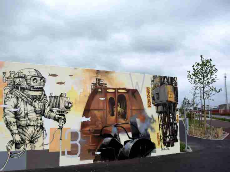 *Les fresques créées dans le cadre du festival Les Escales ont été réalisées grâce à un partenariat entre le festival Les Escales et SILENE (office HLM). Le QM2 des Toqué Frères est dû à une initiative de la blogueuse La Nazairienne et SILENE. Les œuvres de DALeast et David de la Mano ont pu se faire grâce à la Ville de Saint-Nazaire en partenariat avec la galerie parisienne Itinerrance. En cliquant sur les liens vous trouverez d’autres photos et des vidéos, comme par exemple ce timelapse.