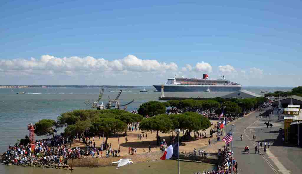 Avant de repartir, il faut monter sur le toit de ce bâtiment pour profiter de la terrasse panoramique (elle est ouverte en même temps que les sites touristiques dans l’écluse fortifiée) pour avoir une vue au plus près de l’estuaire de la Loire. Lors des grands événements liés aux paquebots, c’est aussi un des points de vue les plus prisés. Regardez cette photo que j’ai pu prendre là-haut en juin 2017, à l’occasion de la manifestation The Bridge, lors de l’arrivée du célèbre Queen Mary 2. Vue imprenable sur l’estuaire, devenu ce jour-là une magnifique scène pour ce beau paquebot !