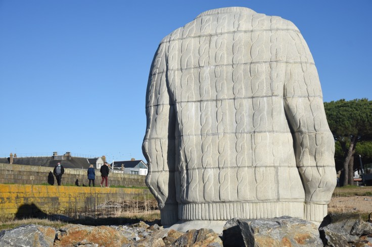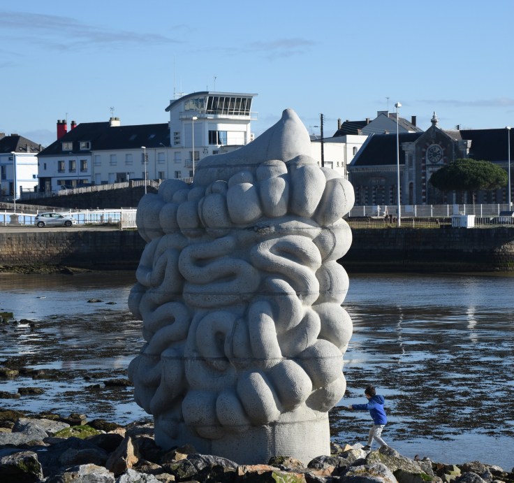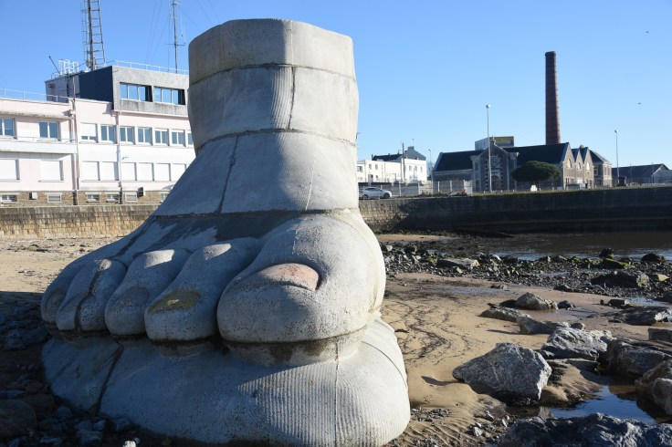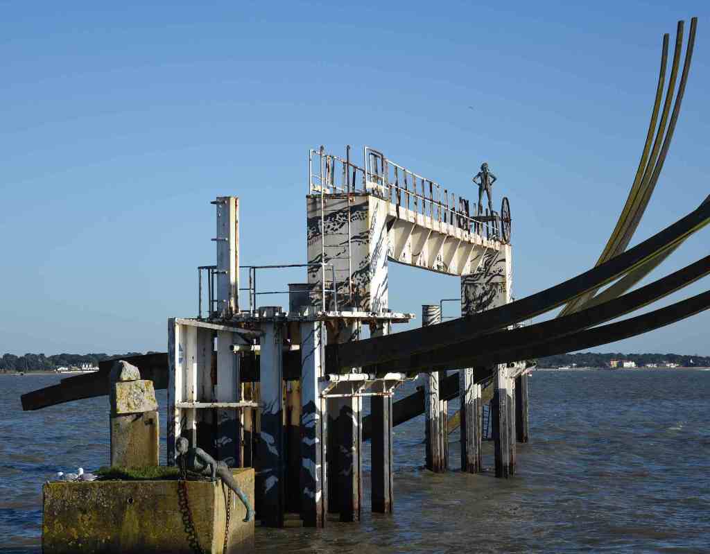 Option avant de traverser le pont : contournez la capitainerie qui se trouve devant vous pour voir trois sculptures monumentales, installées tout début 2021, Le pied, le pull et le système digestif. Ces œuvres de Daniel Dewar et Gregory Gicquel font partie d’Estuaire, parcours d’art contemporain conçu par le Voyage à Nantes, le long de l’estuaire de la Loire.