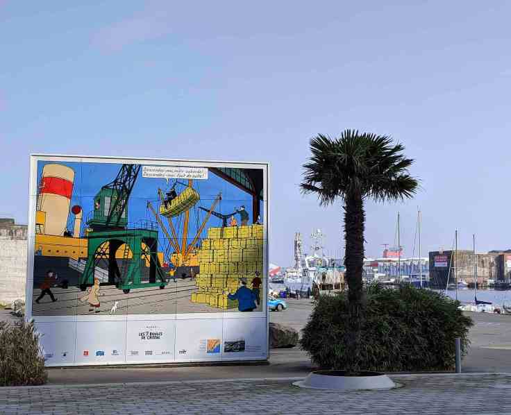 Avant de commencer la promenade, arrêtez-vous quelques mètres avant le pont levant, à hauteur de l’arrêt de bus, et regardez ce grand panneau représentant une scène d’une aventure de Tintin. L’album Les Sept boules de cristal se passe en partie à Saint-Nazaire, et le périple de Tintin et du capitaine Haddock est retracé avec une série de vignettes géantes, la plupart autour du port (gardez les yeux ouverts, vous en verrez d’autres !). Sympa comme prélude à la balade, non ?