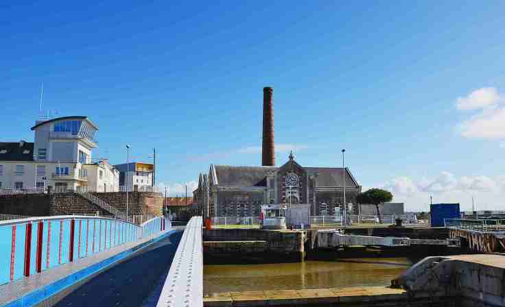 Traversez le pont bleu et profitez de la vue sur le beau bâtiment de l’ancienne usine élévatoire, surmontée de sa haute cheminée en briques. De 1911 à 1989 elle jouait un rôle très important, celui de réguler et maintenir à niveau la hauteur d’eau dans les bassins, en pompant de l’eau dans l’estuaire. Un coup d’oeil aussi sur le bâtiment du pilotage qui surplombe l’usine élévatoire : il se distingue par une immense verrière au dernier étage et deux ancres sur la façade. Encore aujourd’hui, chaque navire de plus de 75 m de long doit faire appel aux pilotes de Loire, les seuls à connaître la navigation extrêmement complexe dans l’estuaire.