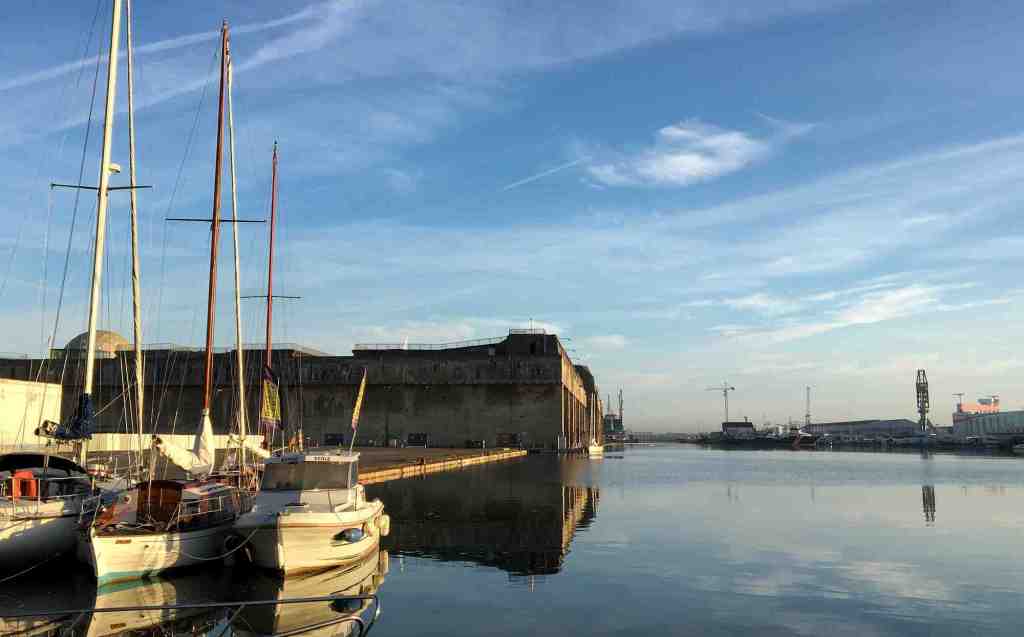 Il faut maintenant quitter la zone portuaire en passant par le pont du Perthuis, à la jonction des deux bassins portuaires. Continuez tout droit jusqu’au boulevard Paul Leferme où vous prenez à gauche, longeant l’entreprise Cargill France qui produit de l’huile végétale. La base sous-marine se dresse devant vous dans toute sa masse.