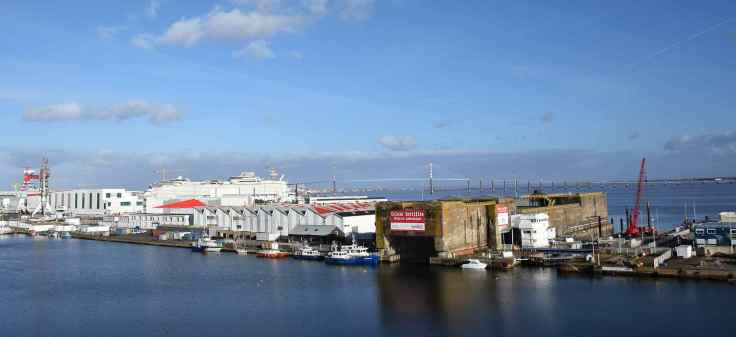 Avancez maintenant jusqu’au milieu du pont à droite de ce quai pour avoir une vue sur l’énorme forme-écluse Joubert, construite entre 1929 et 1933. Pour moi c’est l’ouvrage portuaire le plus imposant. Remplie d’eau, c’est une écluse, permettant le passage de gros navires entre l’estuaire de la Loire et le bassin de Penhoët. Mais je la préfère vidée de ses quelques 260 000 mètres cubes d’eau, quand elle sert de cale sèche supplémentaire pour les Chantiers de l’Atlantique et qu’elle accueille par exemple un paquebot pour les tout derniers travaux avant la livraison à l’armateur. C’est alors que l’on se rend compte que ses dimensions (elle fait 350 m de long, 50 m de large, et sa hauteur est d’environ 15 m) sont vraiment gigantesques. Des travailleurs-fourmis s’affairent autour et sur un navire-géant… vous les avez repérés sur la photo ?