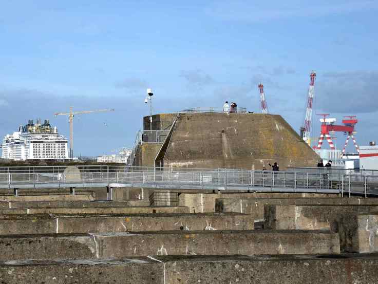 A l’angle de l’immeuble qui porte la fresque, tournez à gauche et très vite prenez encore à gauche la large rampe piétonne qui vous donne accès au toit de la base sous-marine. Je suis sûre que vous passerez pas mal de temps sur le toit, à admirer la vue (ou plutôt les vues, de plusieurs côtés) et à vous étonner de l’architecture militaire qui faisait de la base sous-marine un bunker quasiment indestructible.