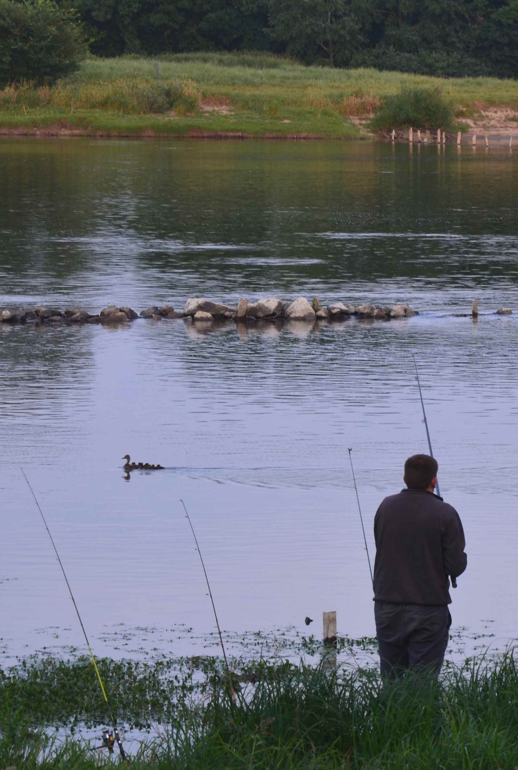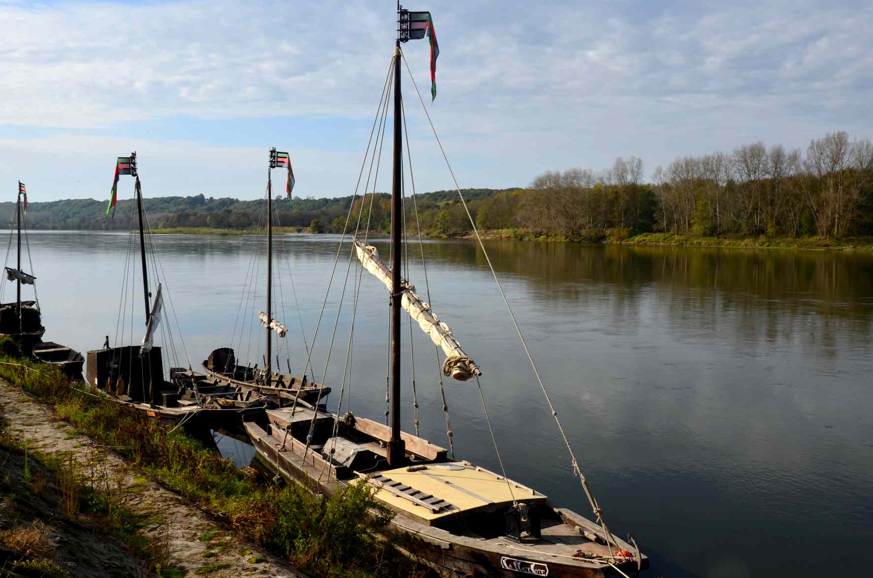 Différents visages de la Loire : une vue sur Saint-Florent-le-Vieil, des bateaux traditionnels amarrés à Bréhémont, Saint-Mathurin par temps gris, et un pêcheur, du côté de La Pointe, devant lequel passe une maman cane avec ses petits.