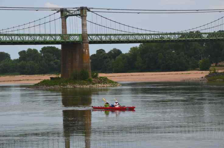 Un kayak griffe le reflet du pont à Ingrandes – Le Fresne-sur-Loire.