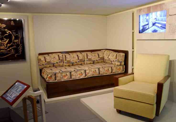 Le « petit truc » en plus ? – Le bar ! A la fin du circuit de visite, on peut faire une pause dans un vrai bar, sous un magnifique lustre provenant du paquebot France de 1961. Ne le répétez pas, mais j’ai un faible pour les cocktails (avec ou sans alcool) créés par le barman du « paquebot »…
