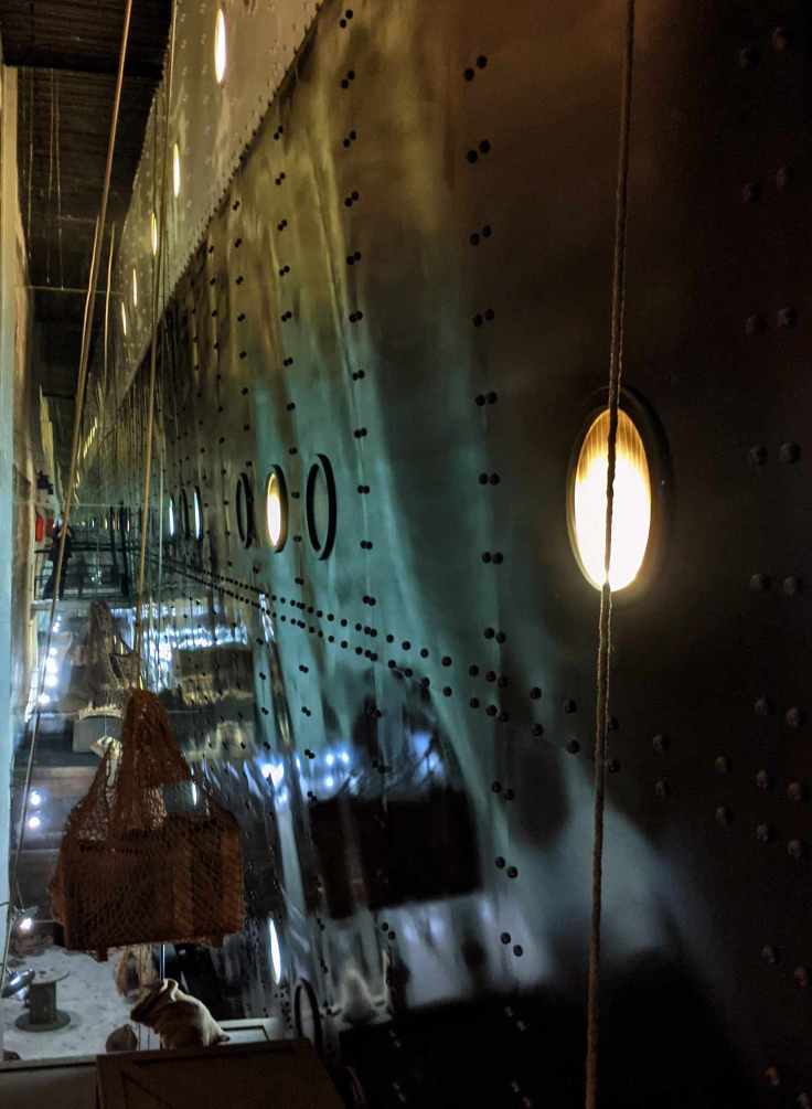 Qu’est-ce que c’est ? – Une machine à voyager et à remonter le temps ! Au cœur de la base sous-marine de Saint-Nazaire, vous montez une passerelle pour franchir une énorme coque de paquebot transatlantique, et c’est parti…