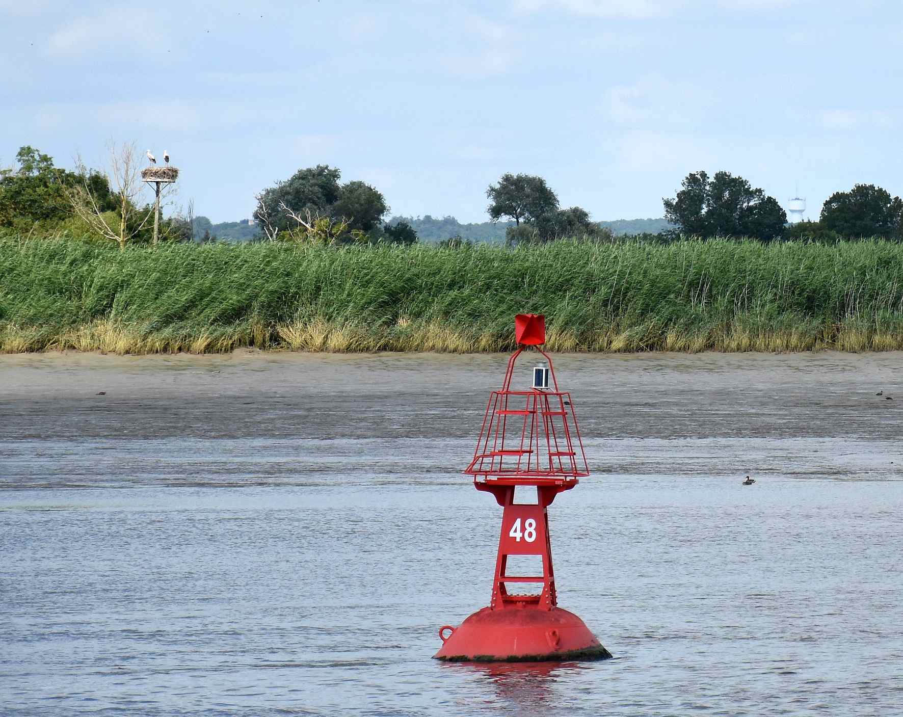 A partir du Pellerin, on va entrer dans la partie « intermédiaire » ou « naturelle » de l’estuaire de la Loire. Sur le fleuve de plus en plus vaste – on atteint maintenant une largeur de 300 à 400 mètres – on est en effet au cœur d’une nature à perte de vue : des roselières qui bruissent au vent, des étiers qui s’enfoncent dans les marais de part et d’autre, des oiseaux qui se reposent sur un banc de sable… La biodiversité est importante avec par exemple plus de 250 espèces d’oiseaux, migrateurs et sédentaires. Ils trouvent une nourriture abondante dans les vasières qui grouillent de vers, mollusques et crustacés, et peuvent facilement nidifier dans les roselières.