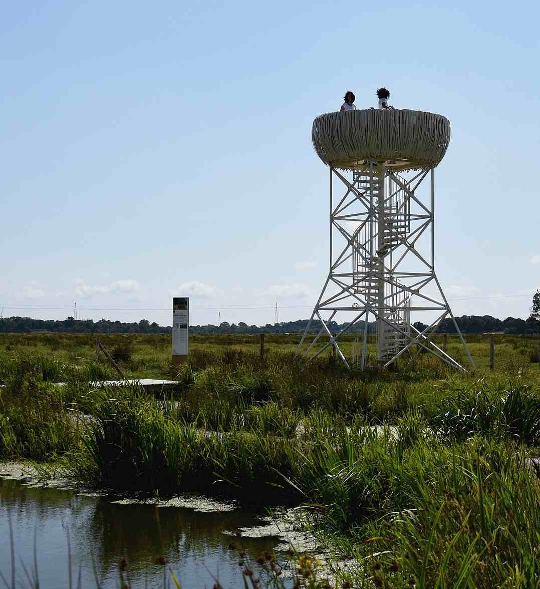 C’est justement à Lavau qu’une autre œuvre du parcours d’Estuaire vous attend, l’Observatoire de Tadashi Kawamata. Situé à environ 20 minutes à pied du village, dans l’ancien lit du fleuve, il domine le canal de la Taillée et vous offre une belle vue de ce paysage estuarien… et au loin, ce mince ruban argenté, c’est bien elle. La Loire !