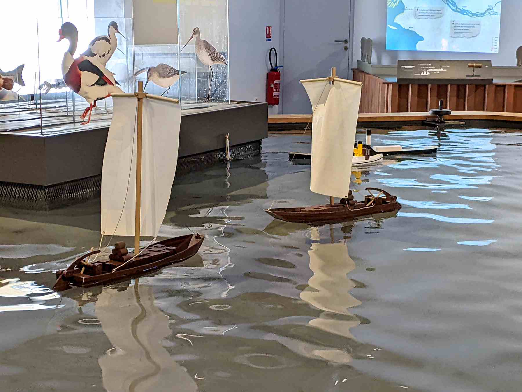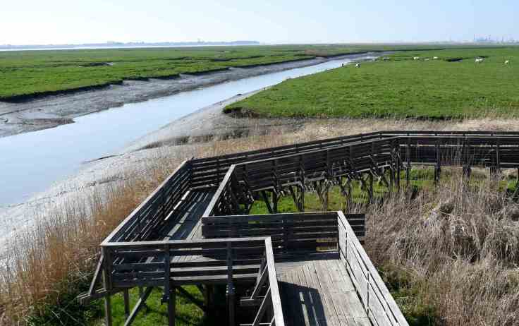 Je vous disais au début de l’article qu’aucune route ne longe l’estuaire. Il y a bien sûr les sites portuaires et industriels qui bloquent l’accès par endroits, mais surtout, la Loire est ici bordée, de part et d’autre, de vastes zones de marais, environ 18 000 ha de prairies et zones humides. Les innombrables étiers, canaux et douves qui sillonnent ces marais représenteraient un linéaire de plus de 1 800 km ! Vous trouverez encore plus de détails sur le site d’Estuarium, centre d’éducation au patrimoine de l’estuaire de la Loire.