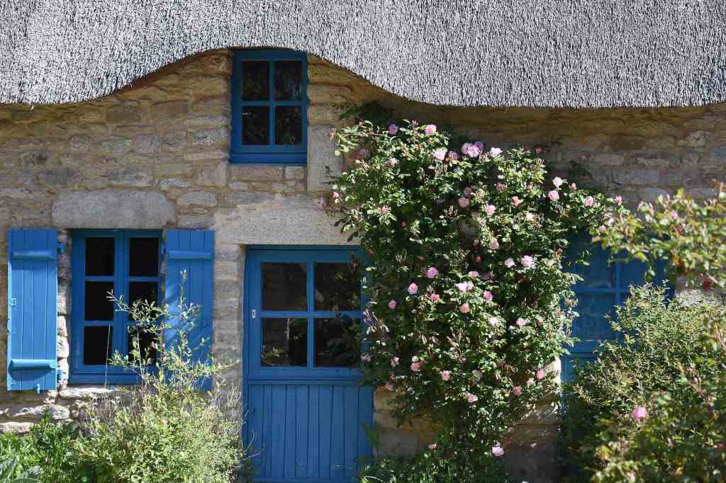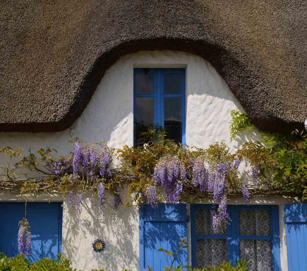 Admirez les chaumières qui sont très en beauté : elles se parent ici d’une belle glycine, là de rosiers exubérants.