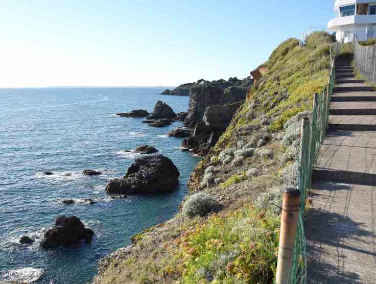 A partir du phare de Villès-Martin, les Nazairiens ne parlent plus du front de mer mais du chemin des Douaniers, ou chemin côtier (tout cela est en fait le GR34). L’ambiance devient franchement maritime, vous longez des plages et des criques, la vue s’ouvre sur une côte d’abord très verte avant de laisser la place aux falaises. Chaque plage est une nouvelle tentation, invitation à faire une pause, tâter la température de l’eau ou juste contempler le jeu des vagues…