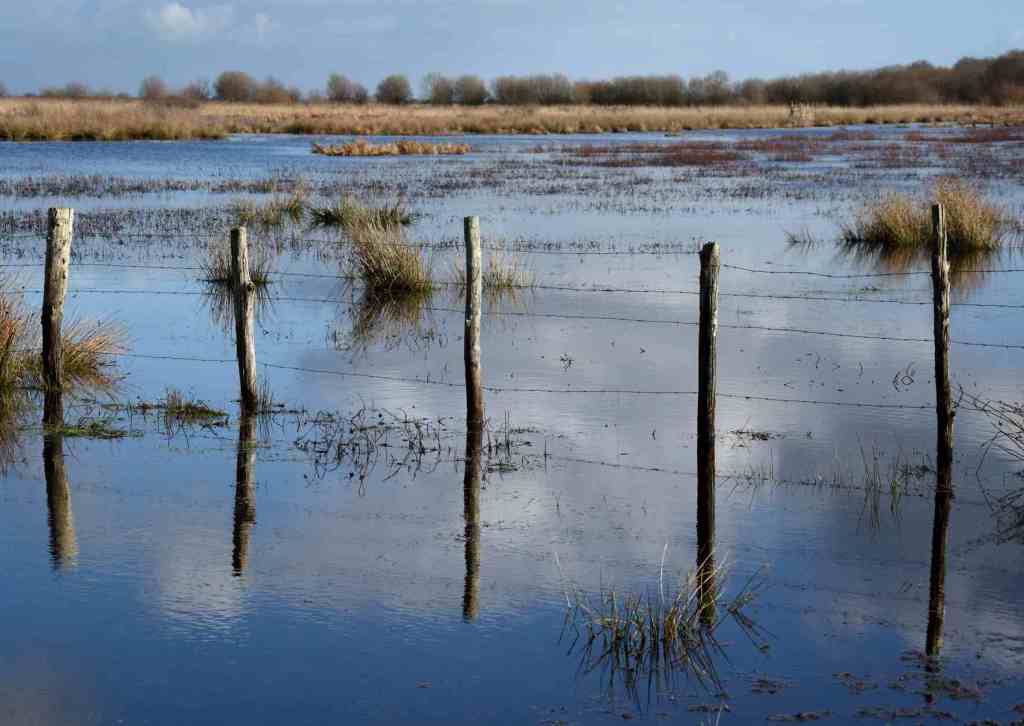 Les bottes de chaume qui sèchent sur le port de La Chaussée Neuve se dédoublent aussi avec leur reflet dans l’eau, tout comme en hiver les clôtures et les arbres nus dans les prairies inondées et les canaux qui débordent.