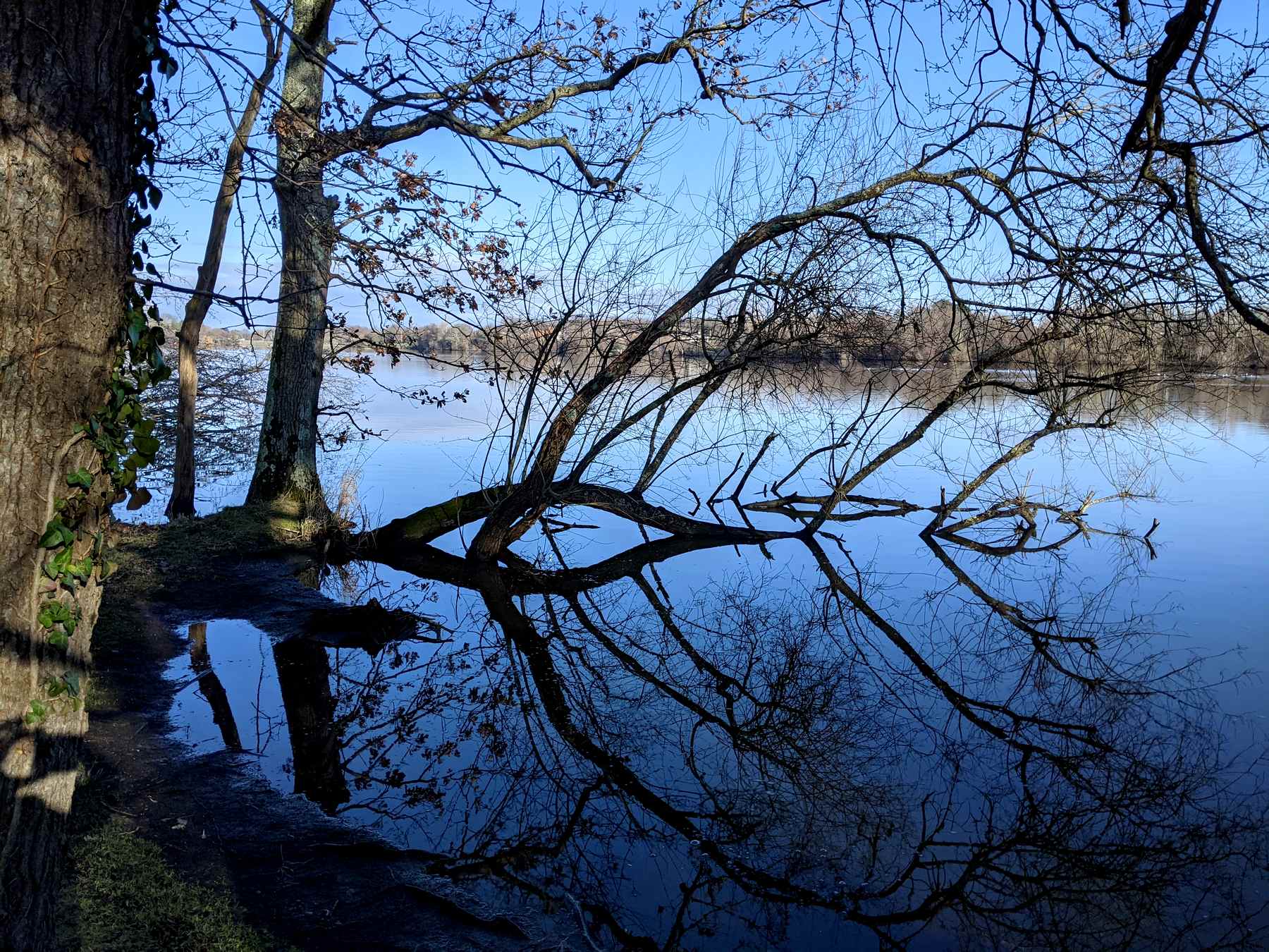 Qui dit Brière dit cours d’eau et canaux, inondations en hiver. Ce ne sont donc pas les reflets qui manquent ici. Cette photo a été prise le long du Brivet, à Rozé ; le ciel était plutôt gris-blanc ce jour-là mais le reflet dans l’eau montre un ciel quasiment bleu…