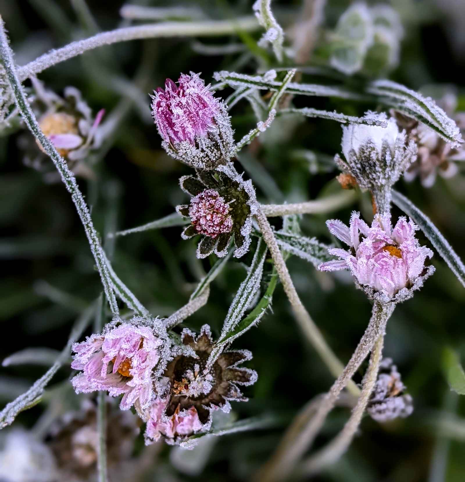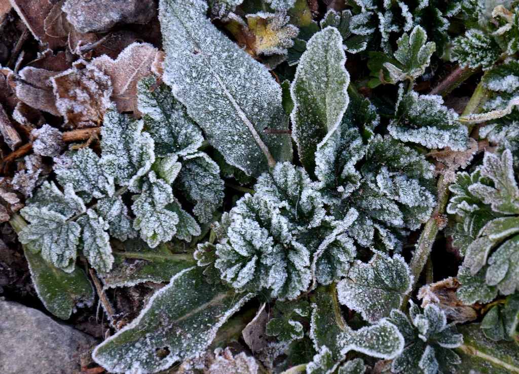 Toutes les photos qui illustrent cet article ont été prises entre décembre et mars. Mais il fallait que je vous en montre deux autres, prises un 4 avril, lors d’une promenade matinale : ces pauvres pâquerettes étaient figées dans un givre tout à fait inattendu à ce moment du printemps !