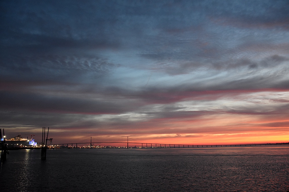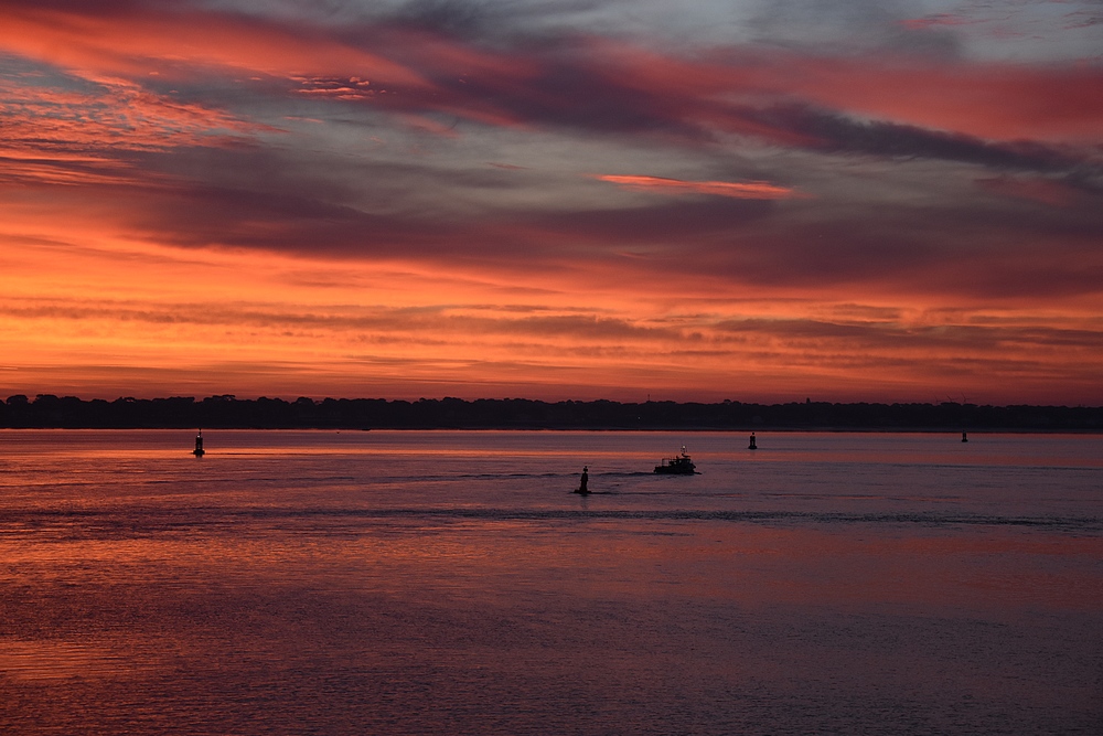 Le ciel sur l’estuaire est encore assez sombre, mais une bande rose-orange se dessine déjà à l’est, en amont du fleuve…