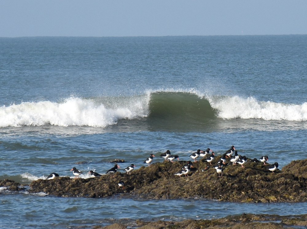 L’autre jour j’ai eu le plaisir de pouvoir observer et photographier pas mal d’oiseaux, surtout dans la première partie du chemin où la côte est très rocheuse. Un groupe de limicoles, indifférent aux vagues, s’était justement installé sur un rocher…