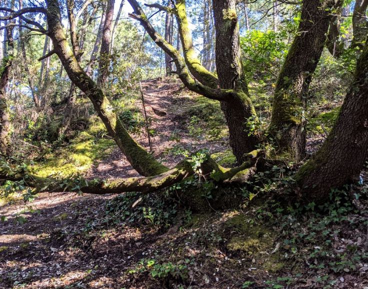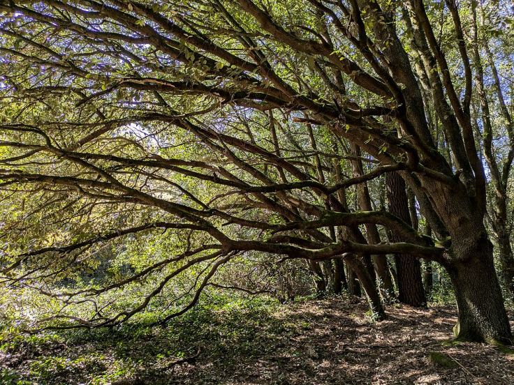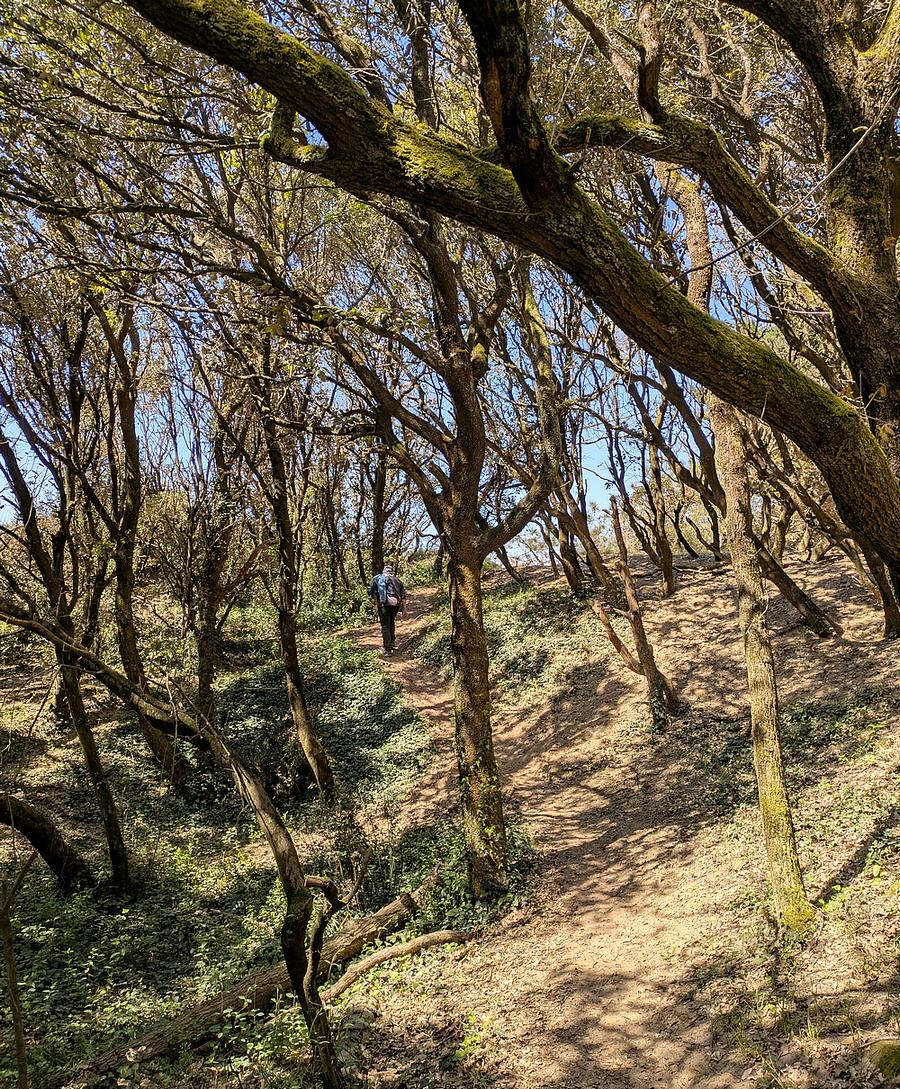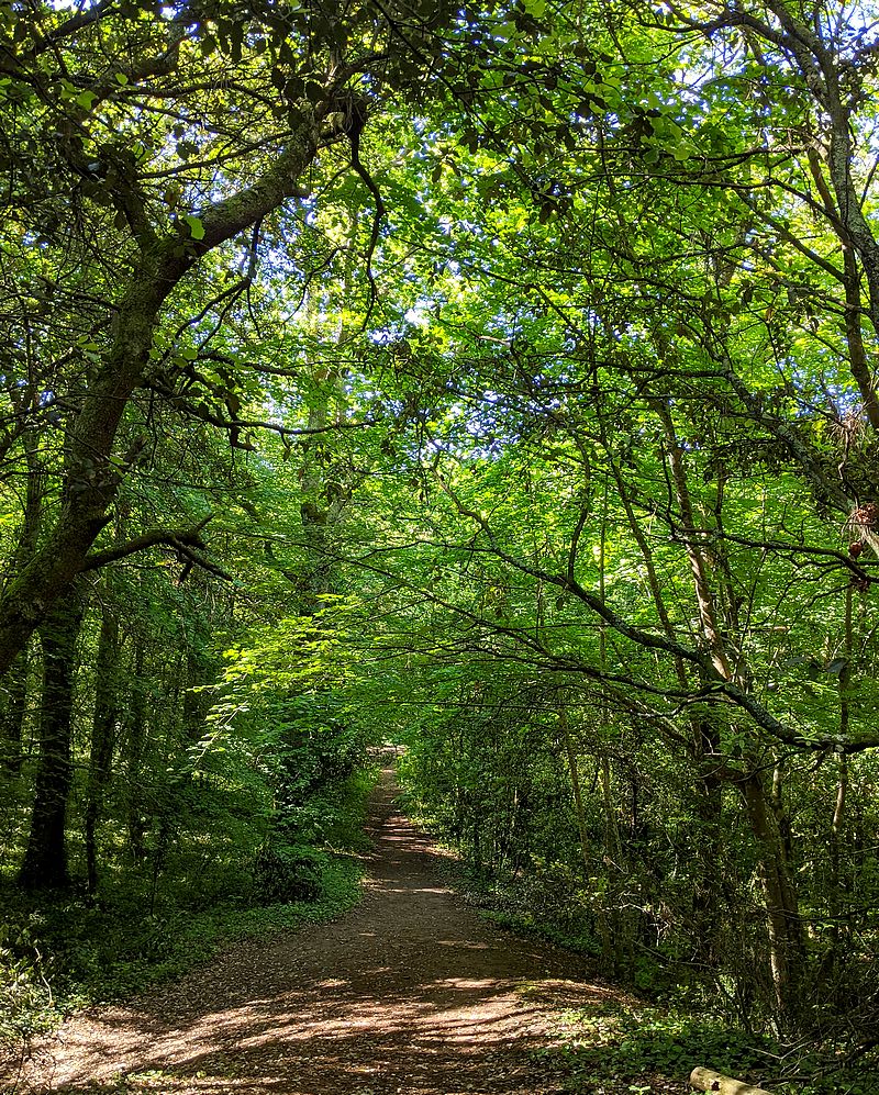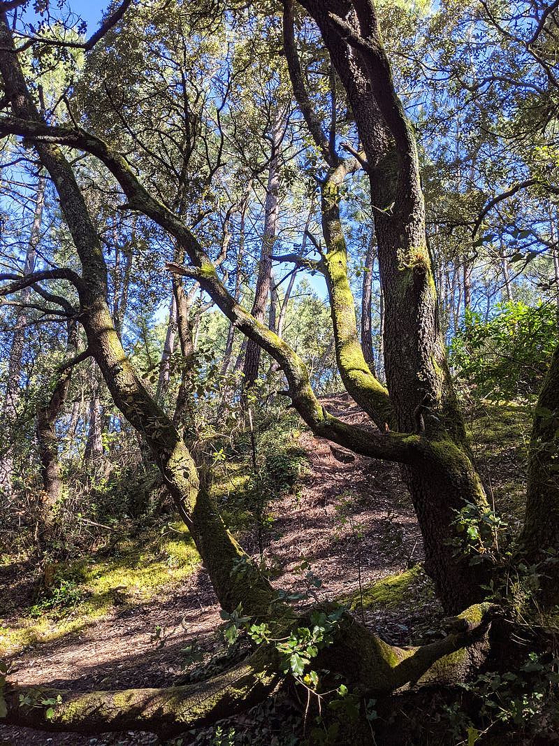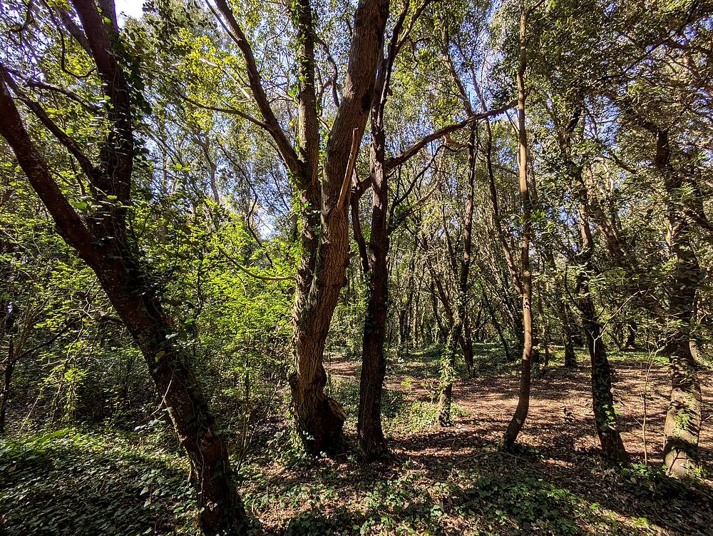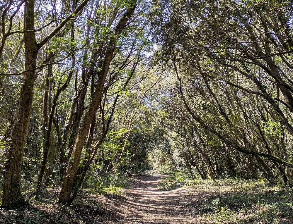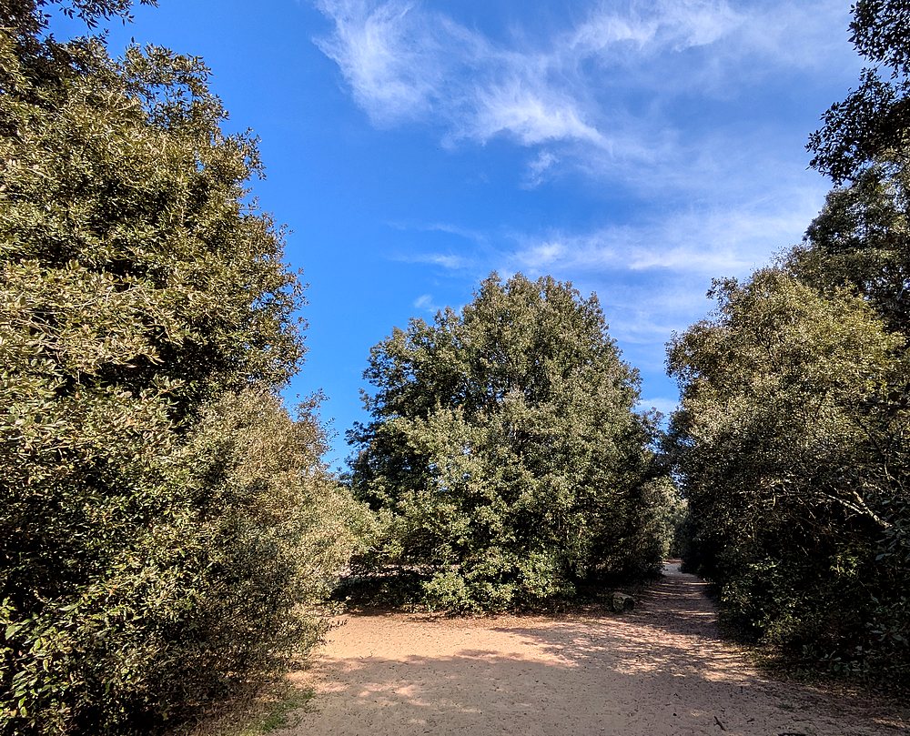 Pour finir, une forêt qui ne s’appelle même pas forêt ! Nous sommes à Pornichet, à la limite communale avec Saint-Nazaire. La petite lande ou forêt de Cavaro (5 hectares) se situe sur une ancienne lande qui a longtemps été cultivée, jusqu’au 20e siècle. Il paraît que des pieds de vigne se cachent encore ici ou là entre les chênes verts… je n’en ai pas vus. La forêt est donc petite, mais quand vous y entrez, vous avez l’impression de pénétrer dans une grande forêt puisqu’il y a des chemins dans tous les sens. Ici pas de relief de dune comme dans les deux autres forêts. Mais on se trouve bel et bien sur une dune : cela s’appelle une dune grise boisée, plantée principalement de chênes verts et de pins maritimes.