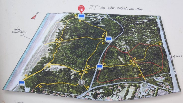 Accès (voir la carte). – Un parking tout au bout de l’avenue des Pierres Couchées jouxte l’entrée de la forêt. De là vous pouvez partir le nez au vent, au gré de votre curiosité, ou vous inspirer du panneau explicatif et des chemins balisés (voir le panneau ci-dessus) pour votre promenade. Autre possibilité : vous vous garez à l’extérieur de Saint-Brevin, en direction de Saint-Michel-Chef-Chef, au parking des Terres Rouges, à deux pas de la plage de Gohaud. De là une belle promenade d’environ un kilomètre – avec vue sur mer – vous amène à la forêt, tout près du menhir de la Pierre Attelée. Côté transports en commun, cela se complique : à proximité du parking de l’avenue des Pierres Couchées j’ai seulement trouvé un arrêt Brevibus, transport local gratuit (arrêt Œillets de la ligne 3, voici le lien vers la plaquette 2025).