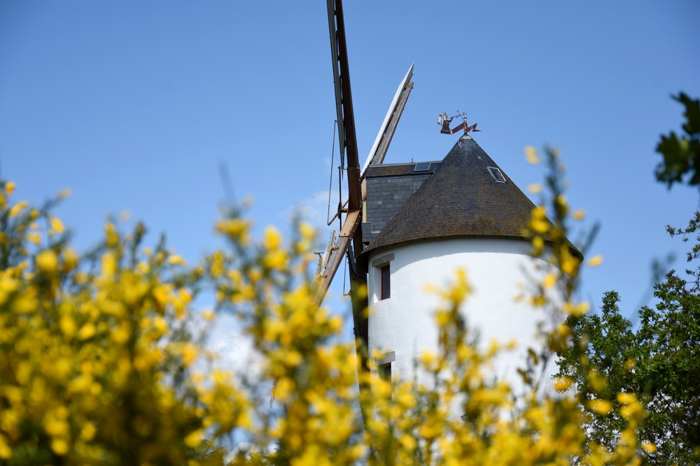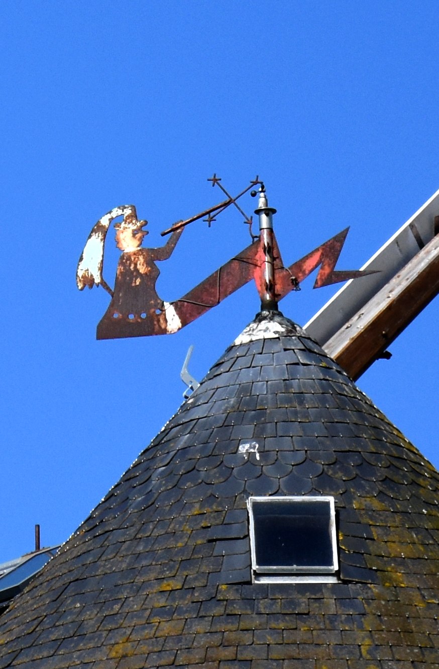 Et juste à côté du dolmen se dresse le moulin de La Masse. Quand je le regarde, je suis assez perplexe : sur les photos ci-dessous, prises en 2019, on voit un drôle de petit personnage, sans doute une girouette, perché tout en haut du toit. Aujourd’hui… plus de personnage. Où est-il donc passé ?