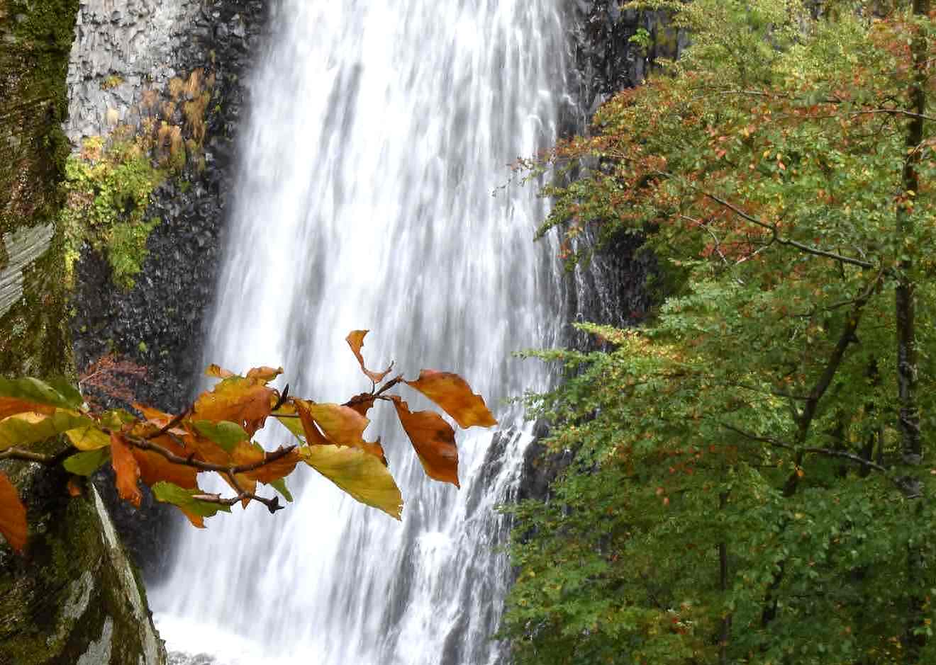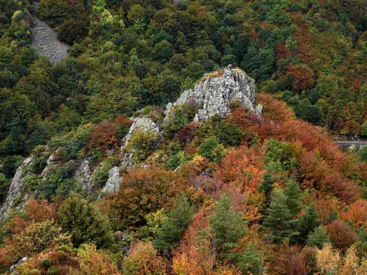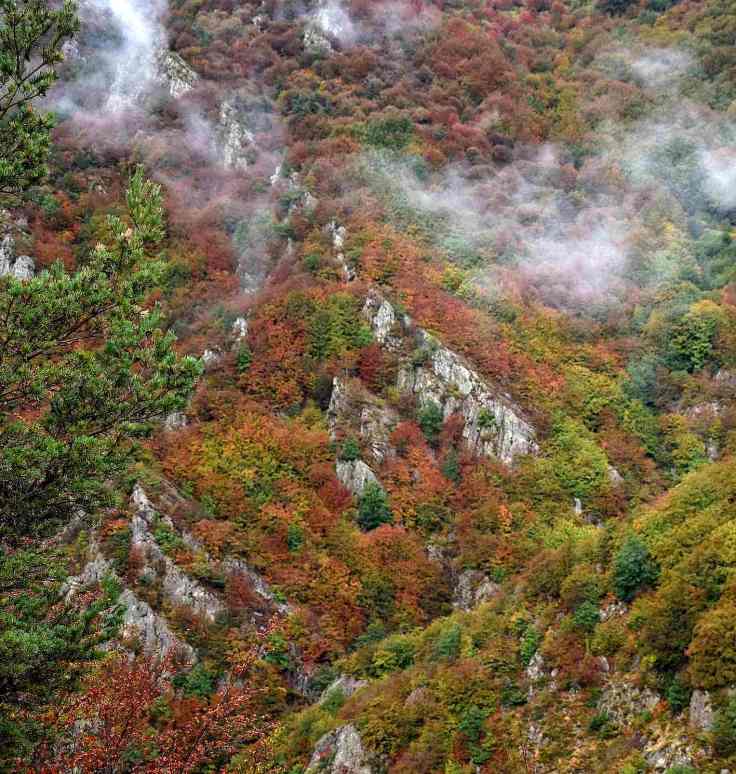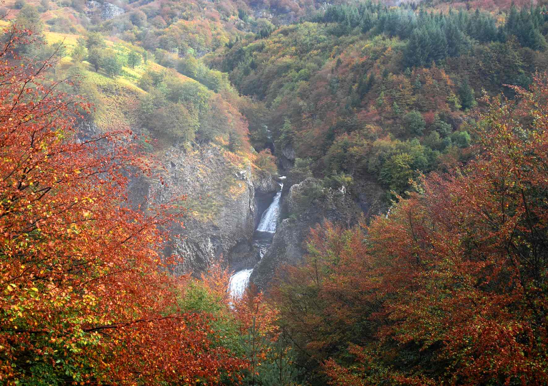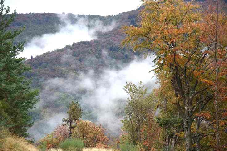Beaucoup de gris sur les photos malheureusement… mais l’automne peut aussi être magnifique dans ce nord de l’Ardèche. Une excursion au Ray Pic, un site naturel classé où une cascade jaillit au milieu de coulées basaltiques, nous l’a prouvé. Des lambeaux de brouillard se levaient doucement sur la forêt, et le beau paysage ne demandait qu’un peu de soleil pour resplendir encore plus dans toutes les riches couleurs de l’automne.