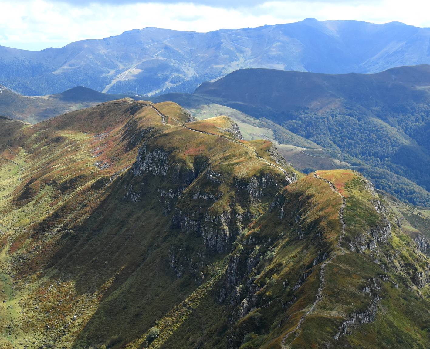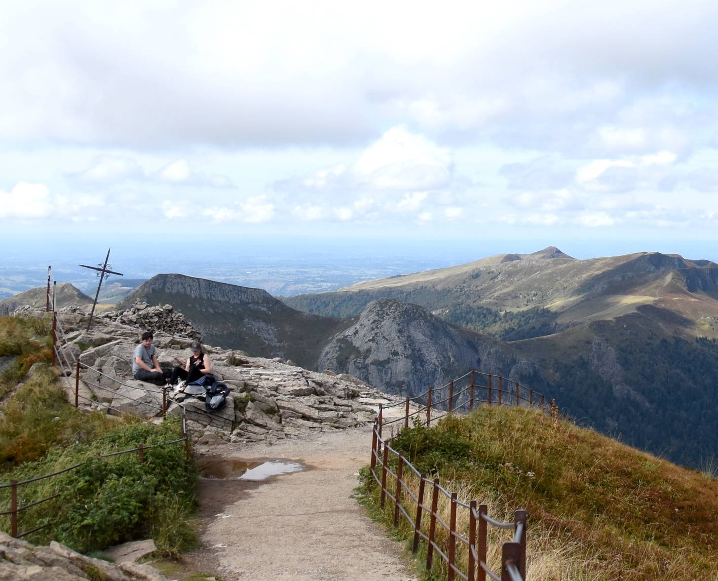 Mais le panorama d’en haut, c’est quand même quelque chose ! L’arrivée sur le sommet du Puy Mary, en Auvergne, n’est pas difficile mais un peu raide et longue, avec beaucoup de marches. La récompense : une vue magnifique… notamment sur un autre sentier, un beau chemin de crête qui me tend les bras.