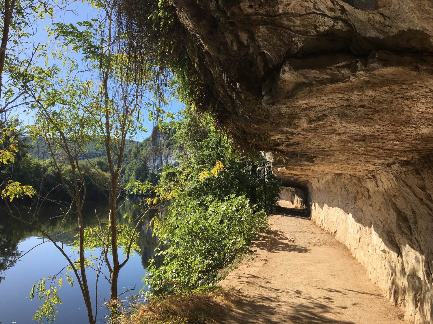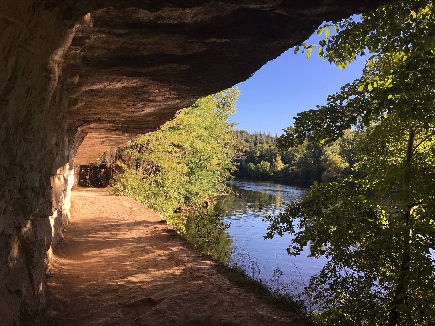 Si vous cherchez un chemin en bordure de rivière qui sorte de l’ordinaire, mettez le cap sur le sud : je vous présente mon coup de cœur, le chemin de halage qui longe le Lot, de Saint-Cirq Lapopie à Bouziès. En 1847, plus d’un kilomètre du chemin a été taillé directement dans la falaise qui surplombe le Lot pour faciliter le halage des gabarres qui transportaient encore énormément de marchandises à cette époque. J’adore marcher ici, entre falaise et rivière, dans la lumière dorée de cette région.