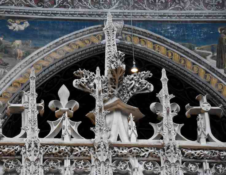 Si j’étais impressionnée par l’extérieur de cette cathédrale, j’étais littéralement éblouie par son intérieur et sa richesse décorative incroyable ! Là aussi, Sainte-Cécile aligne des superlatifs : elle possède le plus grand ensemble français de fresques de la Renaissance et c’est la seule cathédrale d’Europe aux murs et voûtes entièrement peint, ce qui représente une superficie de plus de 18 000 m². Ajoutez la flamboyance du jubé, sa dentelle de pierre, ses dizaines de statues en pierre polychrome dont 72 anges… j’ai passé un long moment au milieu de toute cette beauté.