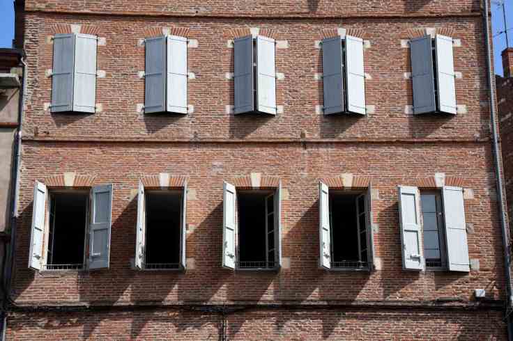 Une dernière photo avant de quitter Albi : une façade percée de multiples fenêtres. Avez-vous vu que pratiquement à chaque fenêtre, les volets présentent une position légèrement différente ? Je me demande encore si c’était tout simplement le hasard, ou si j’étais tombée sur un code secret dans la cité des Albigeois…