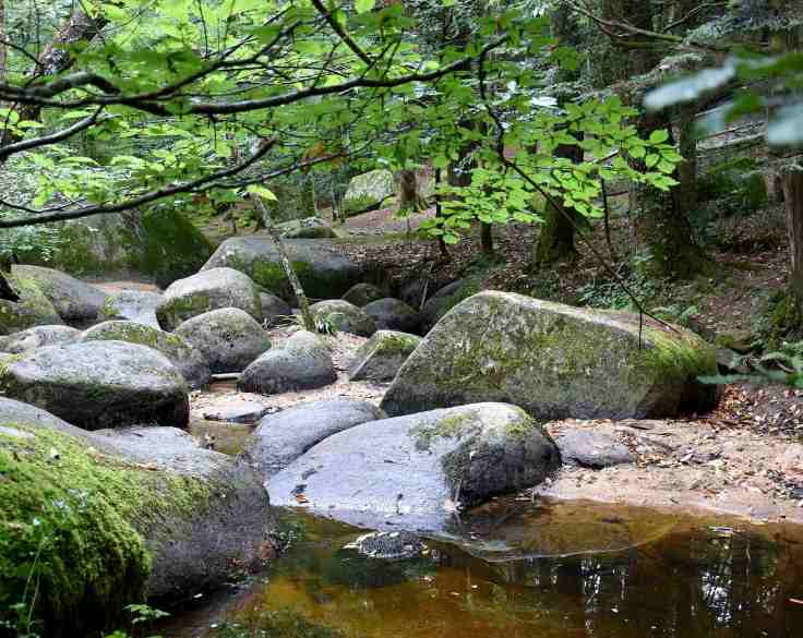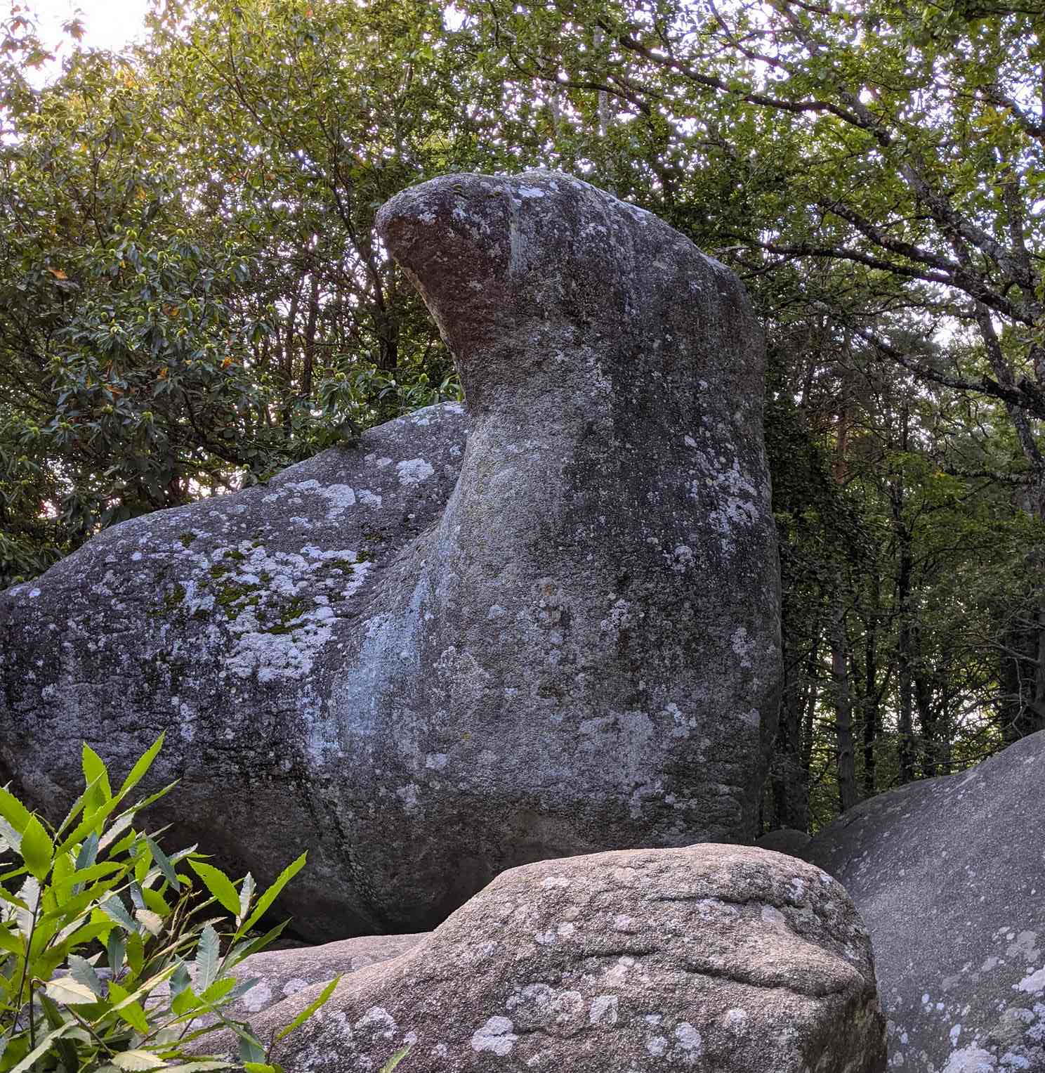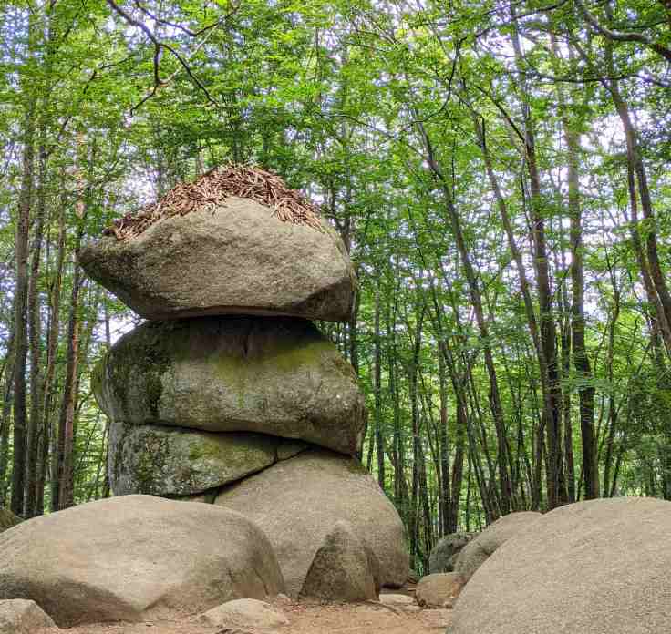 Mais ce qui nous avait attirés dans ce joli coin, qui mériterait d’être plus connu, ce sont les innombrables formations rocheuses, dues à de longs processus d’érosion. Une multitude de sentiers balisés permet de les découvrir. Elles sont vraiment très impressionnantes, même si les noms donnés sont parfois un peu fantaisistes et la ressemblance, disons, peu évidente. Va pour le rocher de l’Oie et le Chapeau de Napoléon que l’on reconnaît facilement…