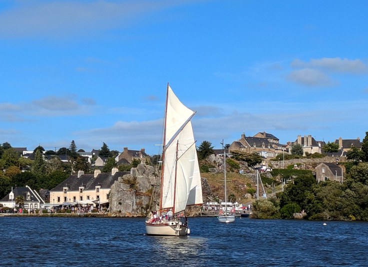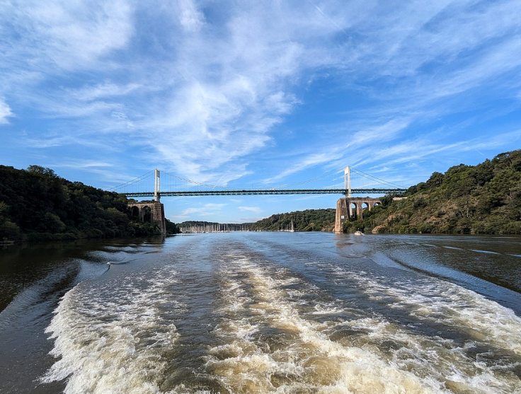 Passage devant La Roche-Bernard : c’est la première fois que je vois cette petite ville médiévale depuis l’eau. Ses ponts assurent le spectacle ! D’abord le pont suspendu de 1960, inspiré du pont de Tancarville, flanqué de deux imposants piliers, vestiges d’un premier pont suspendu (1839–1911) ; un peu plus loin en amont se dessine la courbe épurée du pont du Morbihan, mis en service en 1996.