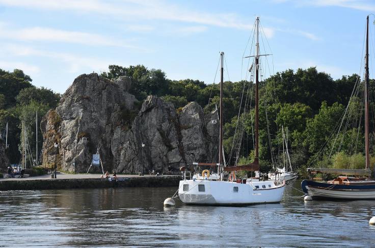 On approche de Redon. A tribord se lève une falaise de grès rouge, tout à fait inattendue ; à bâbord on apercevra bientôt les hangars d’une friche industrielle qui est devenue un véritable spot de street art à Redon.