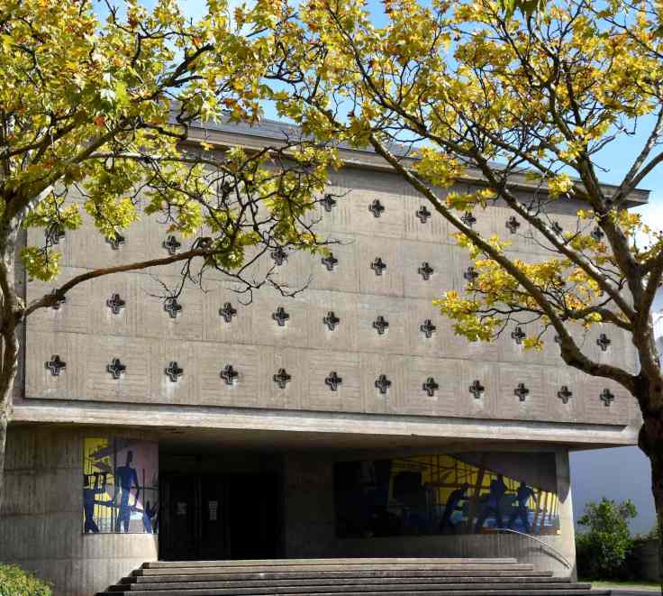 6a – Ces grandes mosaïques sont visibles sur les piliers de l’église Sainte-Anne, une des églises de la Reconstruction à Saint-Nazaire, inscrite aux Monuments Historiques en 2019, et aussi remarquable par ses vitraux modernes, d’où le titre de l’article, V comme… vitraux.