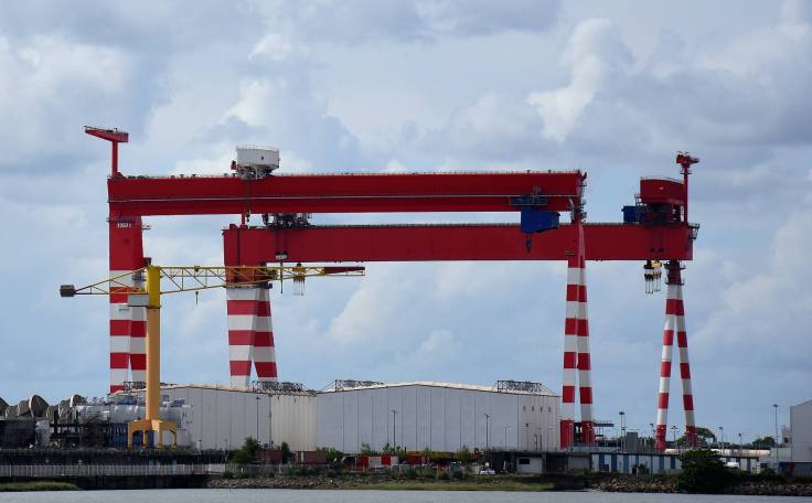 3b – Le portique qui a remplacé le portique Krupp a reçu la même peinture rouge et blanc que le TGP (très grand portique) qui est en place depuis 2014. Le nouveau portique, mis en service cet été, est d’ailleurs plus haut que le TGP ce qui en fait, dans le jargon technique des Chantiers de l’Atlantique, un THP (très haut portique).