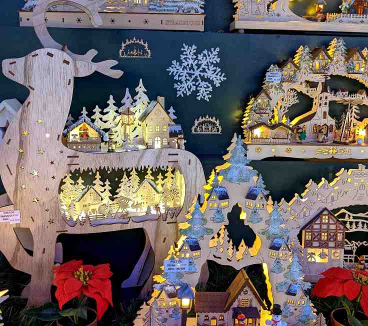 Dans ces chalets on trouve des décorations de sapin, de l’artisanat d’art, des objets-souvenirs où les cigognes le disputent aux bretzels, des bredele et du stollen (traditionnels gâteaux de Noël)… bref, du bon, du beau, du kitsch, un peu de tout. Voici quelques impressions de mes pérégrinations, il manque juste la bonne odeur du pain d’épices et du vin chaud !