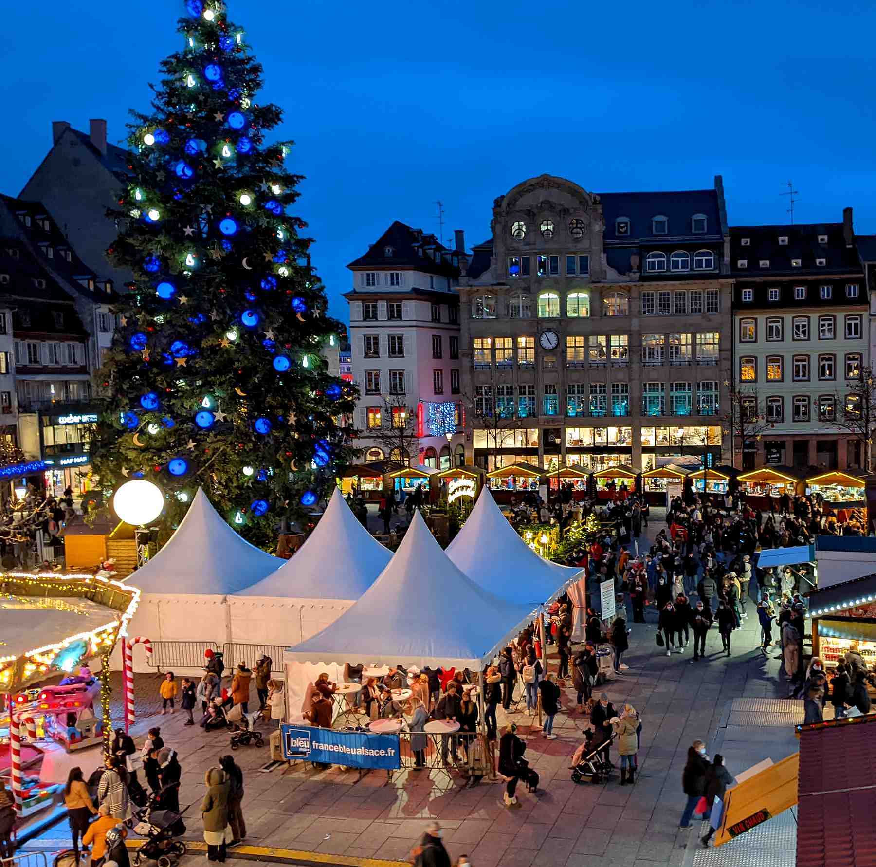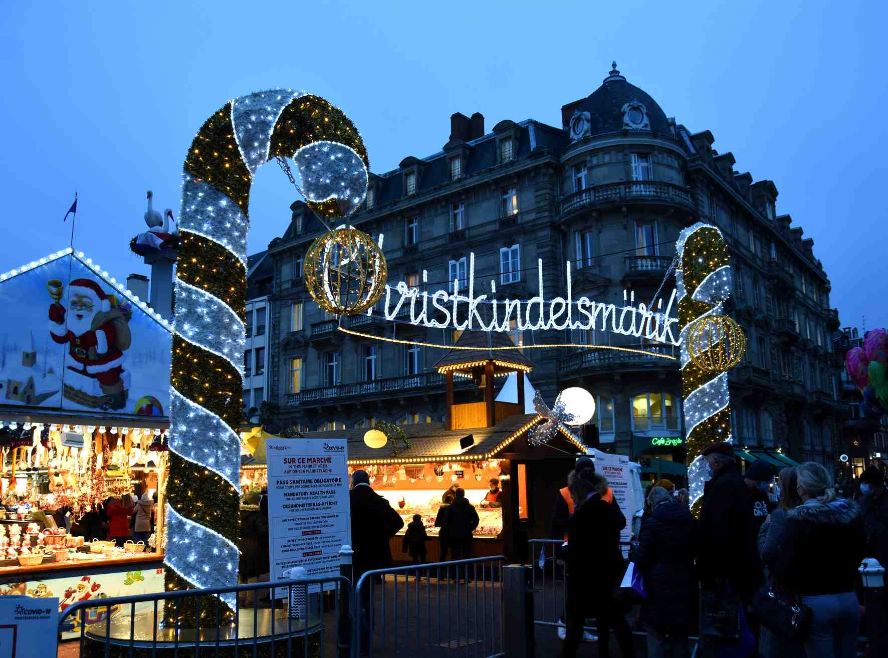 Créé en 1570, le Christkindelsmärik, le “Marché du petit enfant Jésus” de Strasbourg est le plus ancien marché de Noël en France (dans la tradition protestante, c’est l’enfant Jésus qui apporte des cadeaux aux enfants sages). Au fil des années et des siècles, le marché a connu plusieurs emplacements et configurations ; aujourd’hui il dure un mois, à partir du premier dimanche de l’Avent. La ville a toujours eu à cœur que ce marché ait une bonne tenue ; un arrêté municipal de 1863, par exemple, règle très précisément les installations et obligations des « Foires d’hiver dites de bimbeloterie et de Noël« , et depuis quelques années une commission veille à ce que les produits proposés restent en adéquation avec les traditions alsaciennes de Noël. En 1992 Strasbourg se proclame « Capitale de Noël » et le marché de Noël devient un atout touristique majeur : chaque année, on recense jusqu’à deux millions de visiteurs en décembre. En 2020, pas de marché pour cause de pandémie, en 2021 règles sanitaires strictes au moment où une nouvelle vague de COVID arrive en France. Et la sécurité est prise très au sérieux, avec plus de 700 policiers et militaires mobilisés en ville et autour des marchés : l’attentat terroriste de 2018 faisant 5 victimes et onze blessés au marché de Noël est encore dans toutes les têtes.
