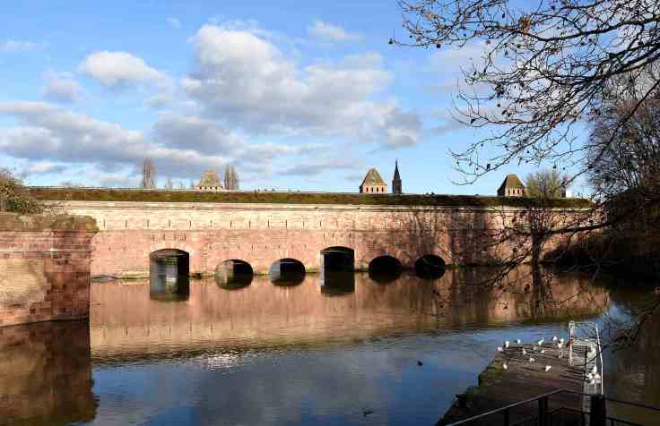 Ce pont-écluse de la fin du XVIIe siècle, long de 120 mètres, enjambe l’Ill dans toute sa largeur. En cas d’attaque, on pouvait fermer les vannes pour inonder les terrains situés au sud de la cité, et donc les rendre infranchissables par l’ennemi.