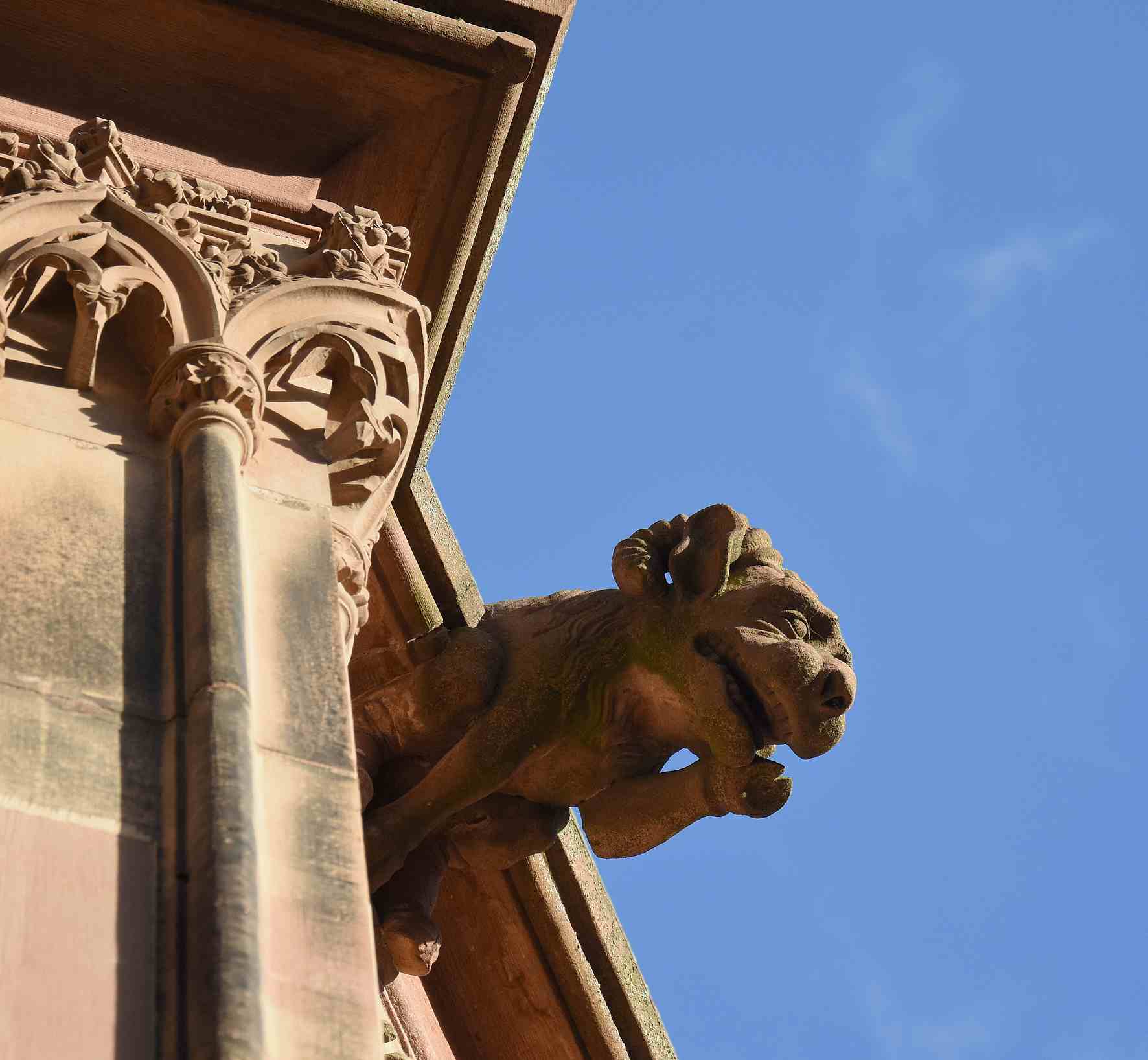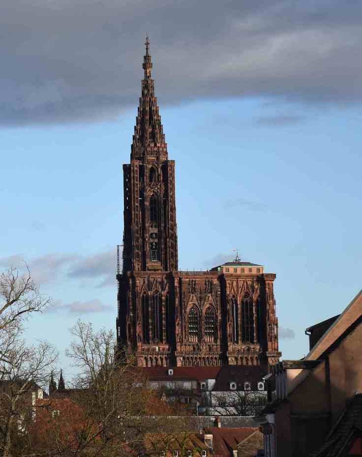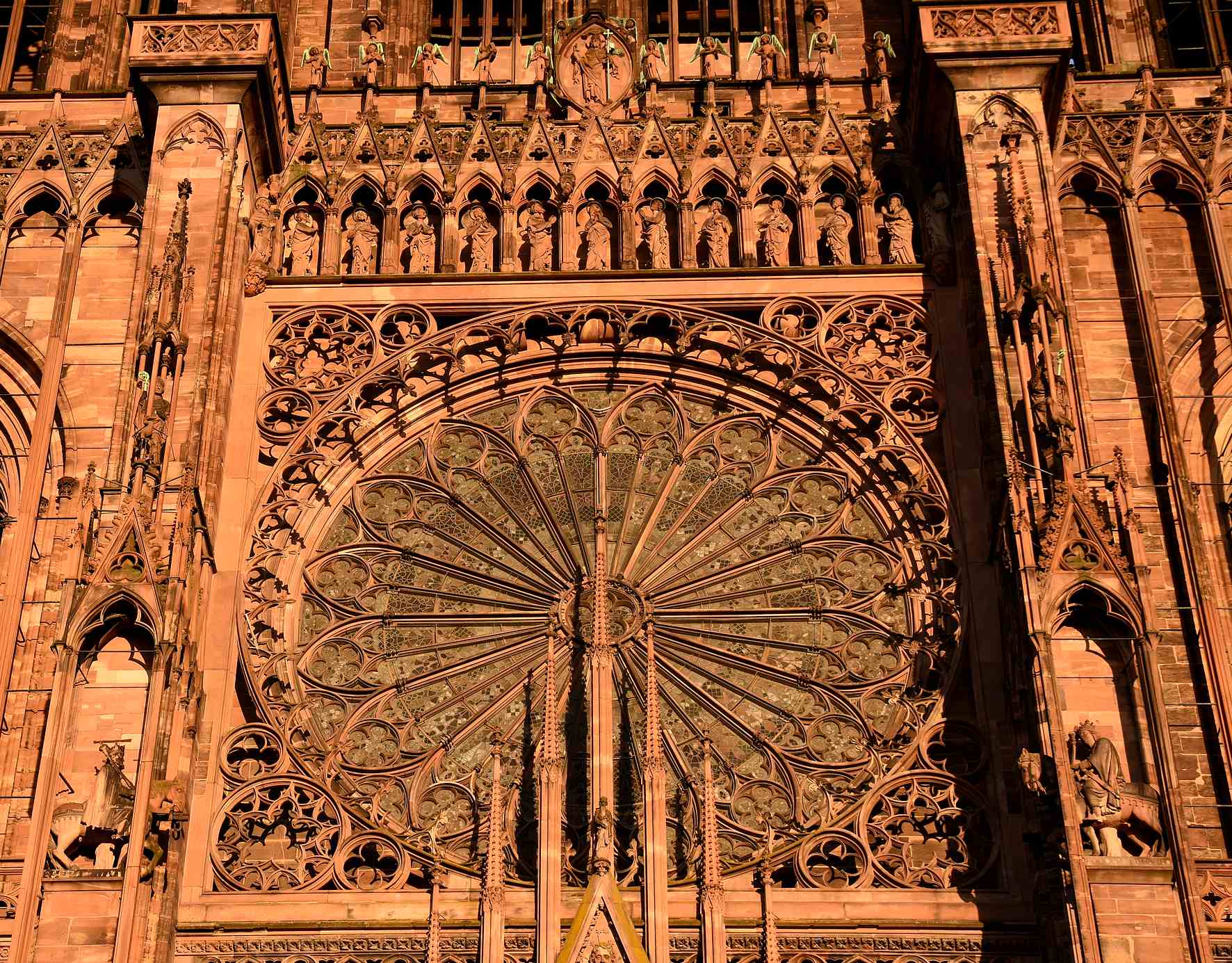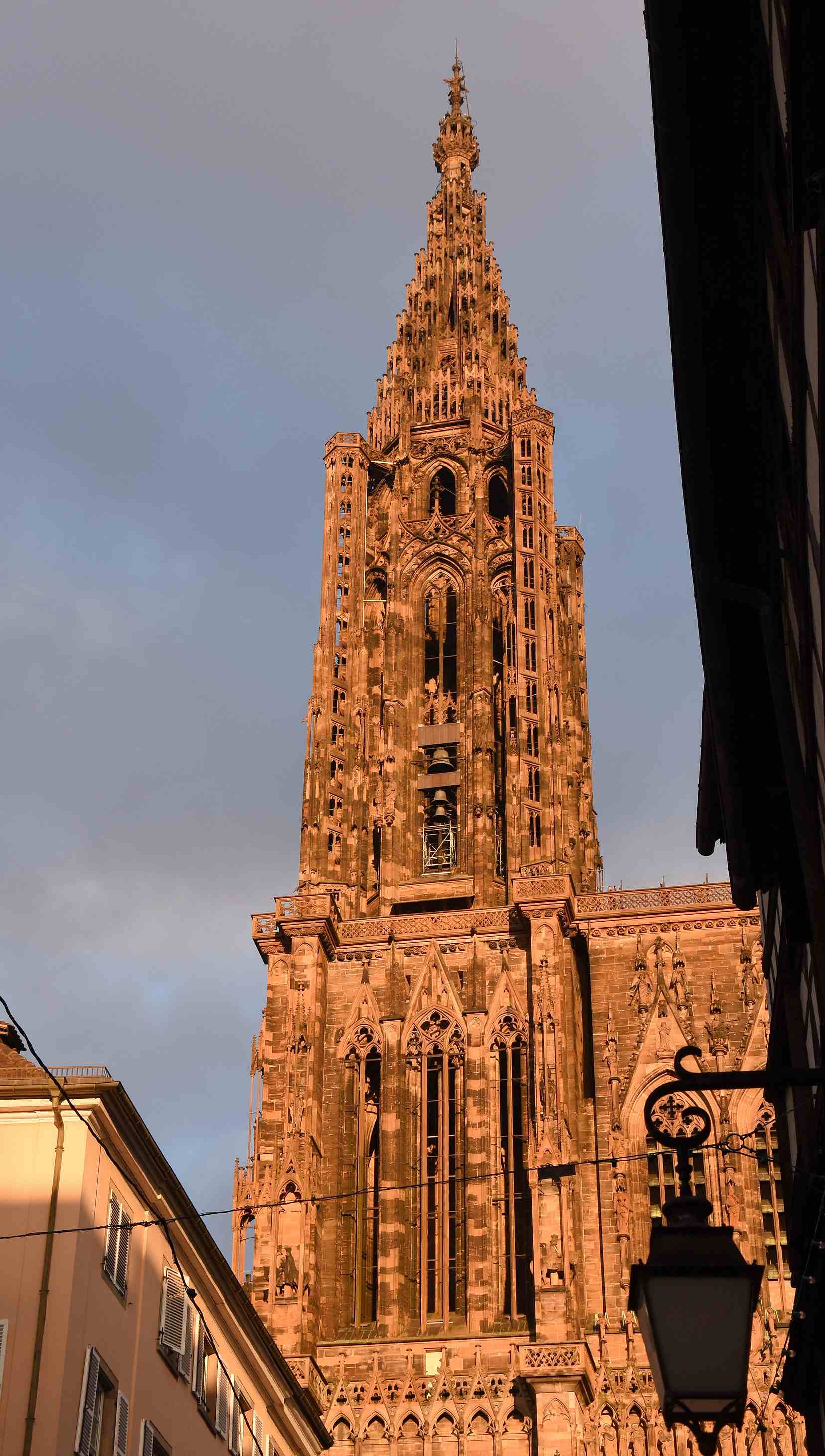 Cet édifice incroyable par sa taille, la profusion et finesse de ses décorations, ainsi que sa belle couleur rouge-ocre, due au grès rose des Vosges, représente allègrement mille ans d’histoire. La première pierre de l’édifice (roman) fut posée en 1015, la nef était terminée en 1275, pour voir la façade et la flèche, dans le style gothique, il a fallu attendre le XVe siècle.