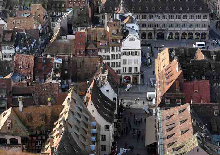Prenant une grande respiration, je suis montée sur la grande plateforme de la façade principale, à 66 m de hauteur, soit 330 marches… et autant pour redescendre, bien sûr ! Là on se trouve au pied de la flèche qui culmine à 142 m (donc encore près de 80 mètres au-dessus de nos têtes), elle avait fait de la cathédrale de Strasbourg le plus haut bâtiment du monde pendant plusieurs siècles. Vue de là-haut, la vieille ville se présente comme un invraisemblable patchwork de maisons et de toits.