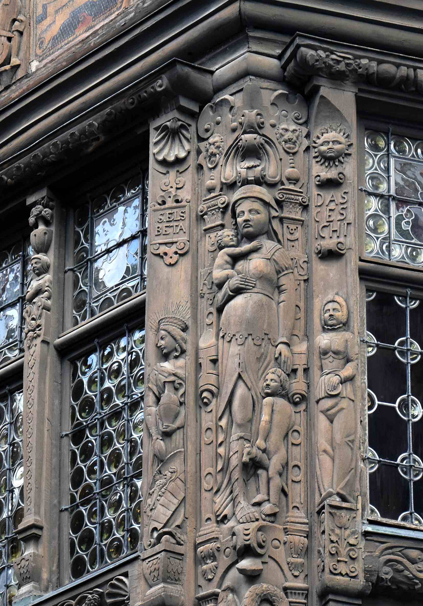 Et bien sûr il y a la célèbre maison Kammerzell, digne voisine de la cathédrale, qui porte magnifiquement ses presque 600 ans. Sa taille, ses 75 fenêtres aux vitraux en cul-de-bouteille, ses pans de bois richement ornementés avec de très nombreux personnages et une profusion de détails, en font une bâtisse vraiment exceptionnelle.