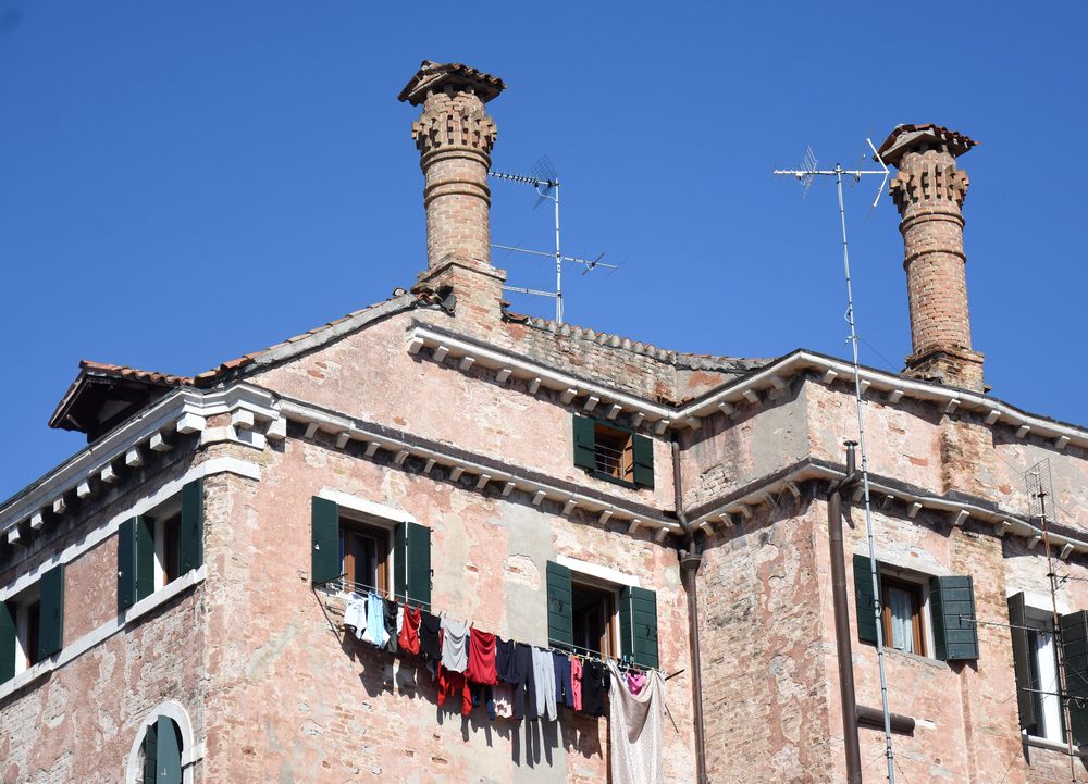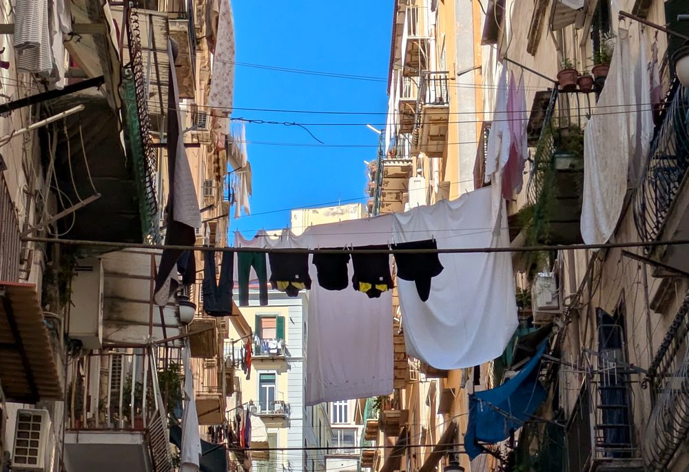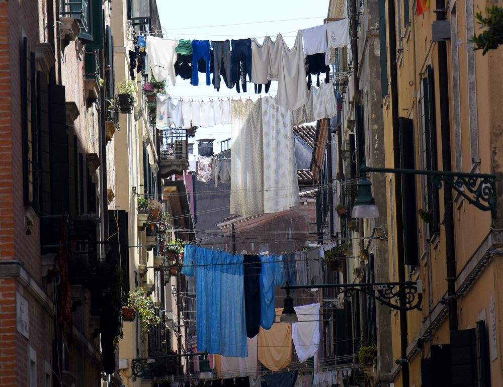 Pas question d’ être voyeurs, bien sûr, mais comment ne pas lever la tête vers ces innombrables fils à linge tendus entre deux immeubles ou le long d’une façade ? A Naples, Venise et Burano, où j’ai pris ces photos, le linge se lave peut-être en famille mais sèche aux yeux de tous.